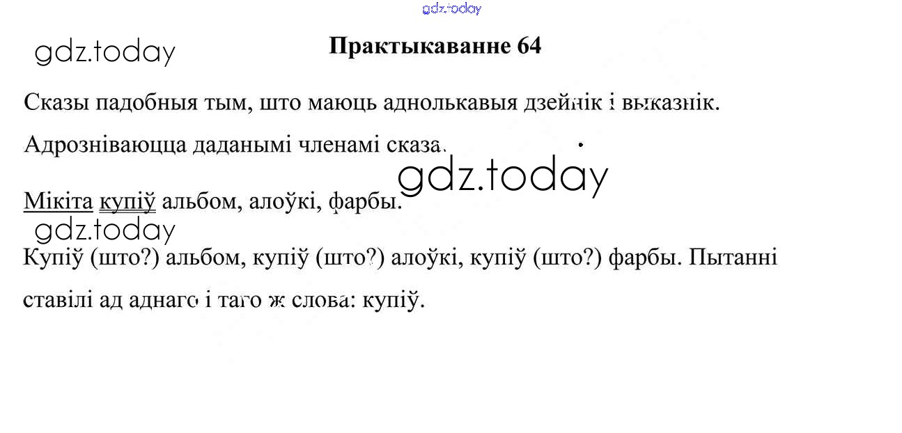 На страницах сайта gdz.today вы найдете учебный и вспомогательный материал, направленный на улучшения знаний школьной программы. ГДЗ - онлайн мир знаний Рашальнік да часткі 1. Практыкаванні 64 Учебнику по Белорусскому языку для 4 класса Свірыдзенка Национальный институт образования 2018