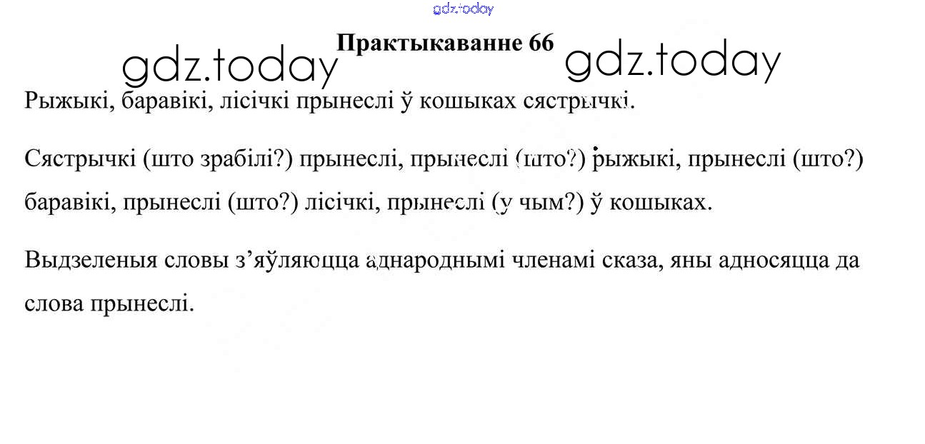 На страницах сайта gdz.today вы найдете учебный и вспомогательный материал, направленный на улучшения знаний школьной программы. ГДЗ - онлайн мир знаний Рашальнік да часткі 1. Практыкаванні 66 Учебнику по Белорусскому языку для 4 класса Свірыдзенка Национальный институт образования 2018