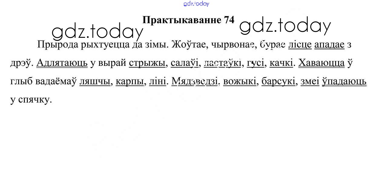 На страницах сайта gdz.today вы найдете учебный и вспомогательный материал, направленный на улучшения знаний школьной программы. ГДЗ - онлайн мир знаний Рашальнік да часткі 1. Практыкаванні 74 Учебнику по Белорусскому языку для 4 класса Свірыдзенка Национальный институт образования 2018