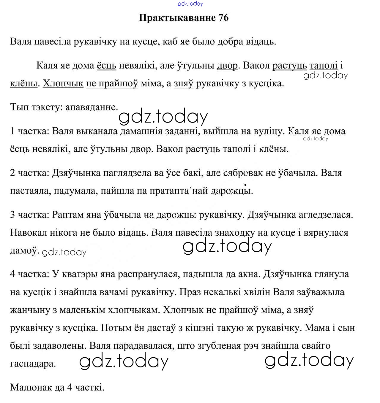На страницах сайта gdz.today вы найдете учебный и вспомогательный материал, направленный на улучшения знаний школьной программы. ГДЗ - онлайн мир знаний Рашальнік да часткі 1. Практыкаванні 76 Учебнику по Белорусскому языку для 4 класса Свірыдзенка Национальный институт образования 2018