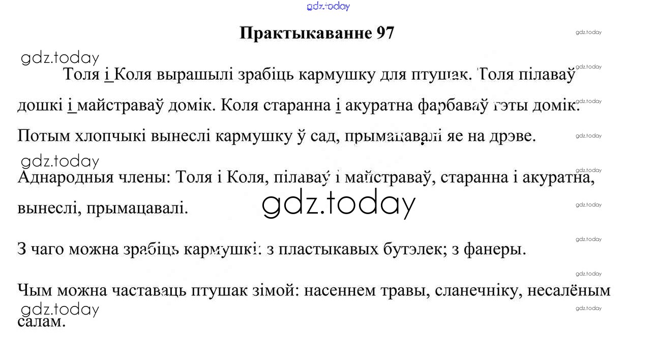 На страницах сайта gdz.today вы найдете учебный и вспомогательный материал, направленный на улучшения знаний школьной программы. ГДЗ - онлайн мир знаний Рашальнік да часткі 1. Практыкаванні 97 Учебнику по Белорусскому языку для 4 класса Свірыдзенка Национальный институт образования 2018