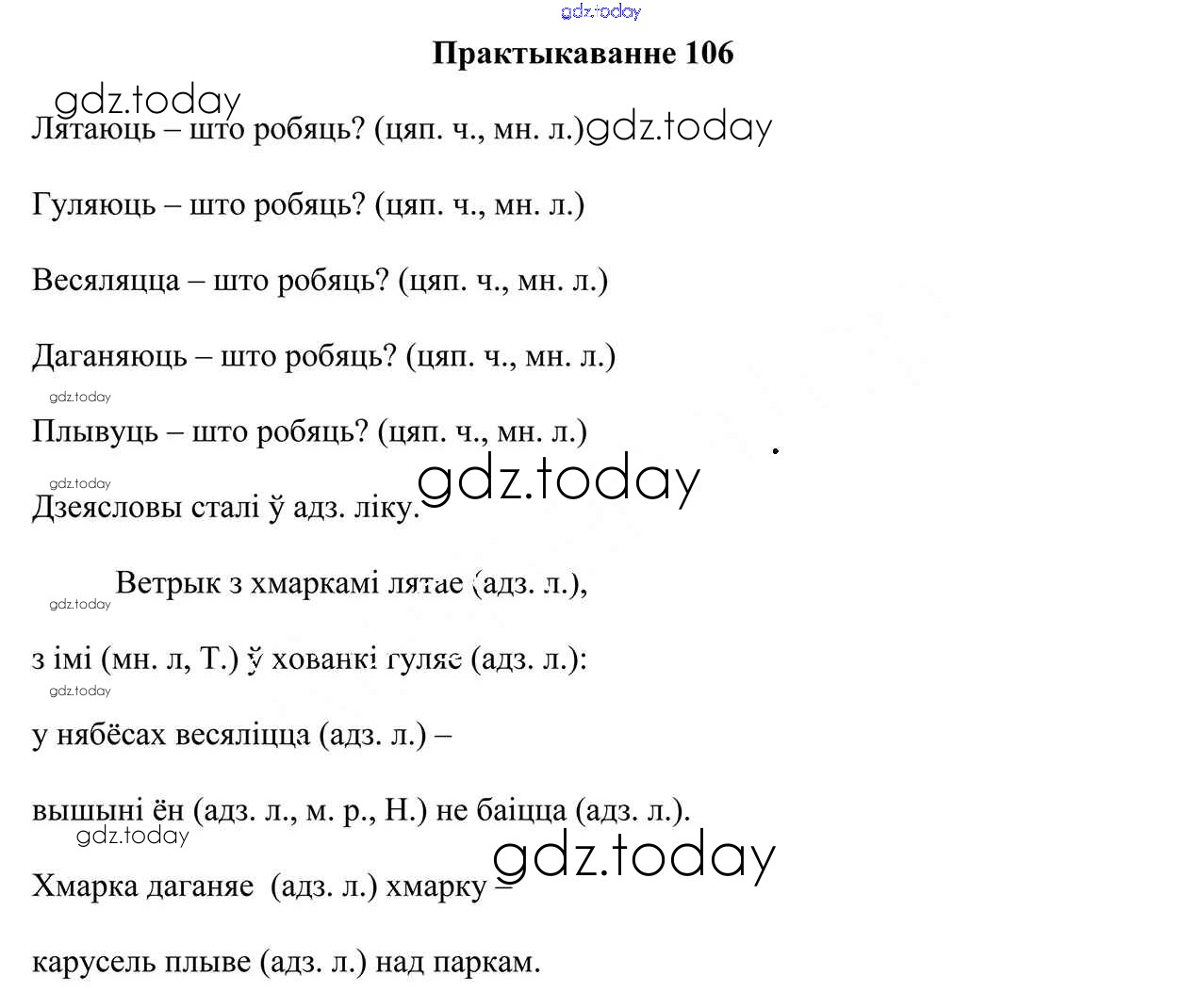 На страницах сайта gdz.today вы найдете учебный и вспомогательный материал, направленный на улучшения знаний школьной программы. ГДЗ - онлайн мир знаний Рашальнік да часткі 2. Практыкаванні 106 Учебнику по Белорусскому языку для 4 класса Свірыдзенка Национальный институт образования 2018