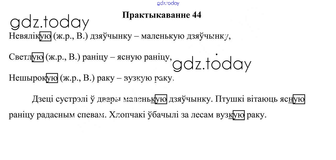 На страницах сайта gdz.today вы найдете учебный и вспомогательный материал, направленный на улучшения знаний школьной программы. ГДЗ - онлайн мир знаний Рашальнік да часткі 2. Практыкаванні 44 Учебнику по Белорусскому языку для 4 класса Свірыдзенка Национальный институт образования 2018