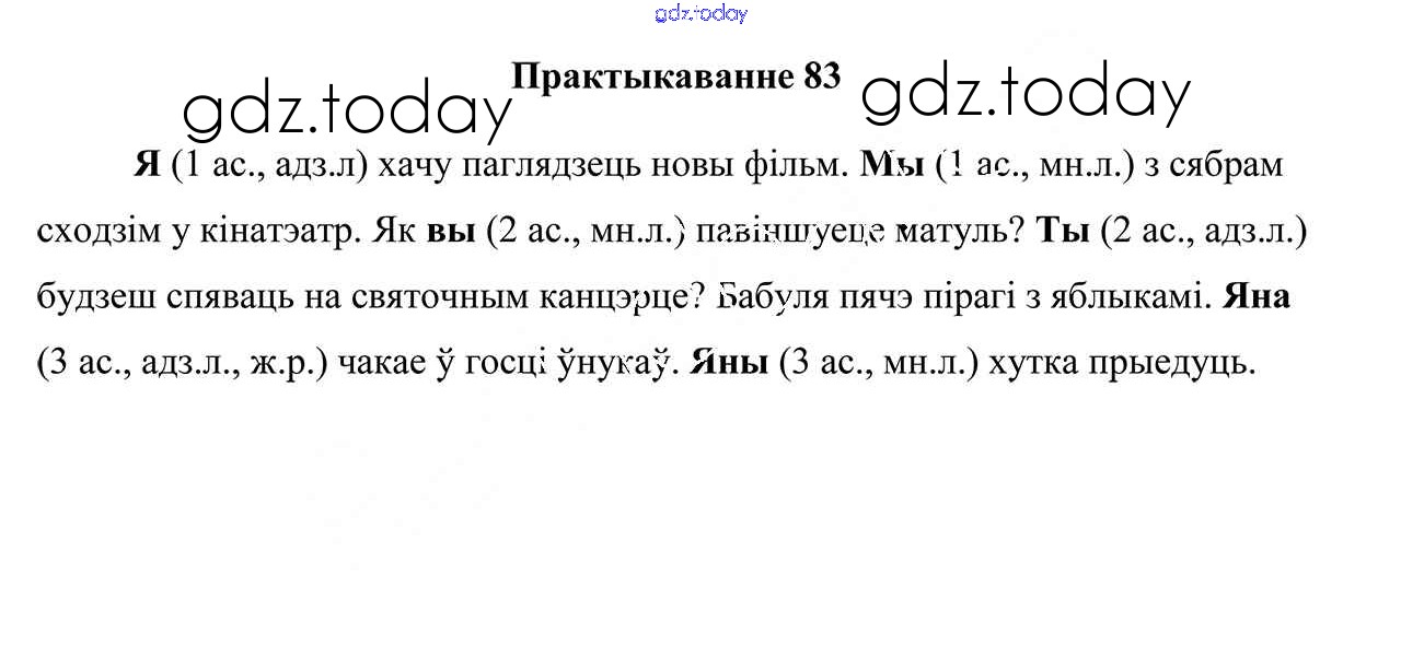 На страницах сайта gdz.today вы найдете учебный и вспомогательный материал, направленный на улучшения знаний школьной программы. ГДЗ - онлайн мир знаний Рашальнік да часткі 2. Практыкаванні 83 Учебнику по Белорусскому языку для 4 класса Свірыдзенка Национальный институт образования 2018