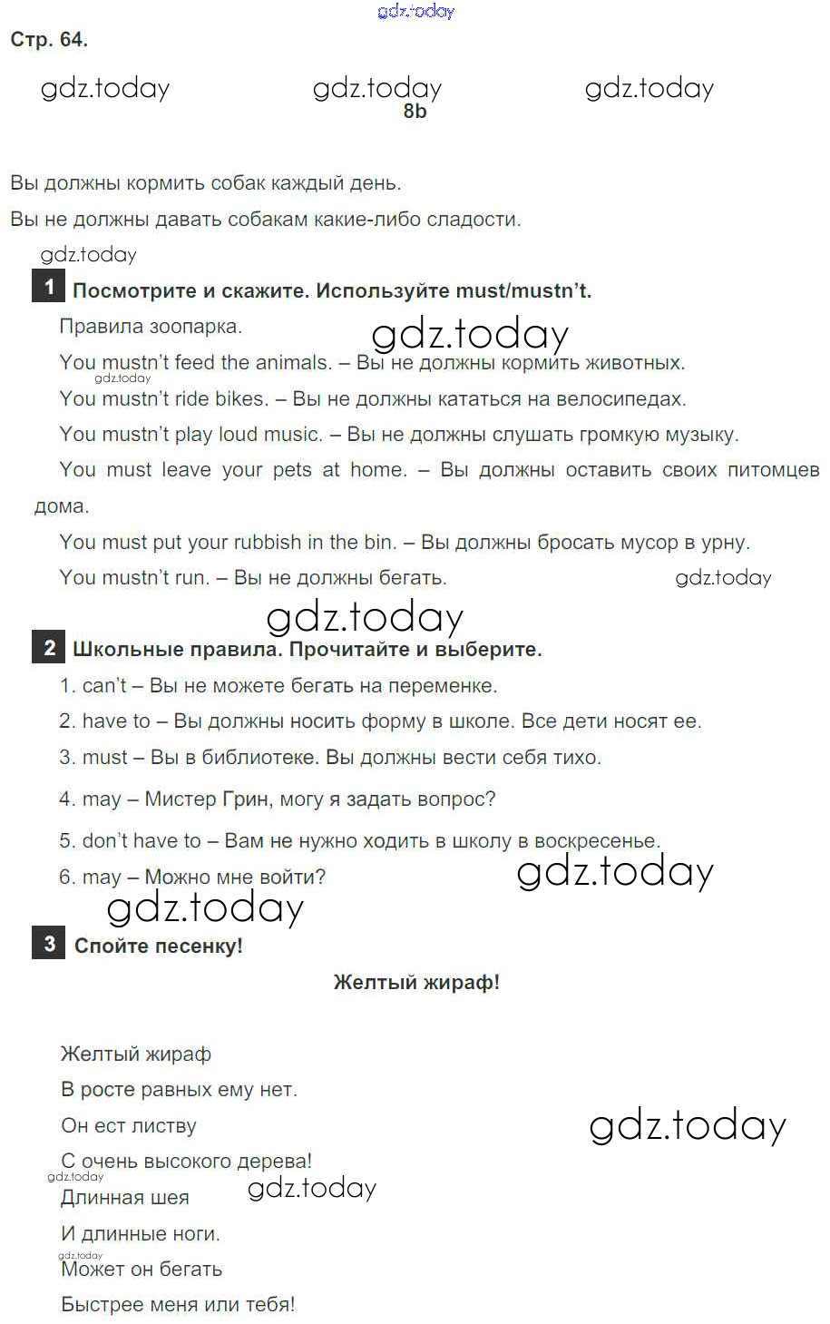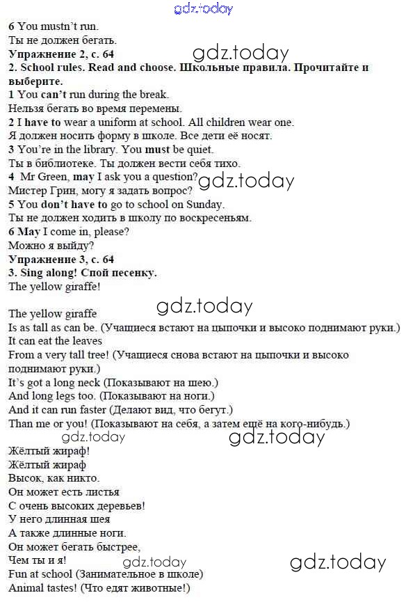 На страницах сайта gdz.today вы найдете учебный и вспомогательный материал, направленный на улучшения знаний школьной программы. ГДЗ - онлайн мир знаний Решение к модулю 4. At The Zoo! страница 64 Учебнику по Английскому языку для 4 класса Быкова, Дули Просвещение Spotlight 2015