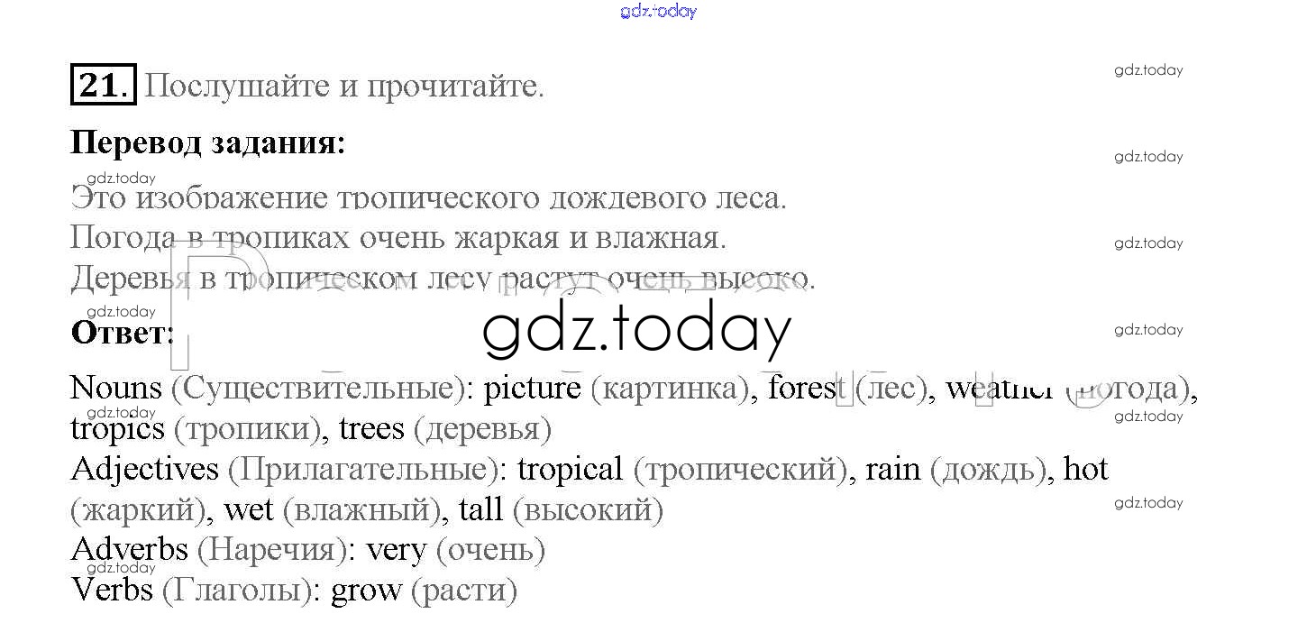 На страницах сайта gdz.today вы найдете учебный и вспомогательный материал, направленный на улучшения знаний школьной программы. ГДЗ - онлайн мир знаний 5. What do you know about rain forests Решение. Часть 1 21 Учебнику по Английскому языку для 4 класса Вербицкая, Эббс Вентана-граф Forward 2018
