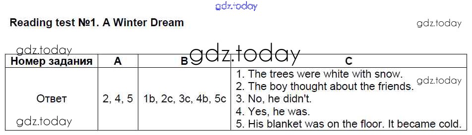 Ответы к Решение к Reading №1. Reading test 1. A Winter Dream Контрольно-измерительным материалам (КИМ) по Английскому языку для 4 класса Кулинич ВАКО 2018