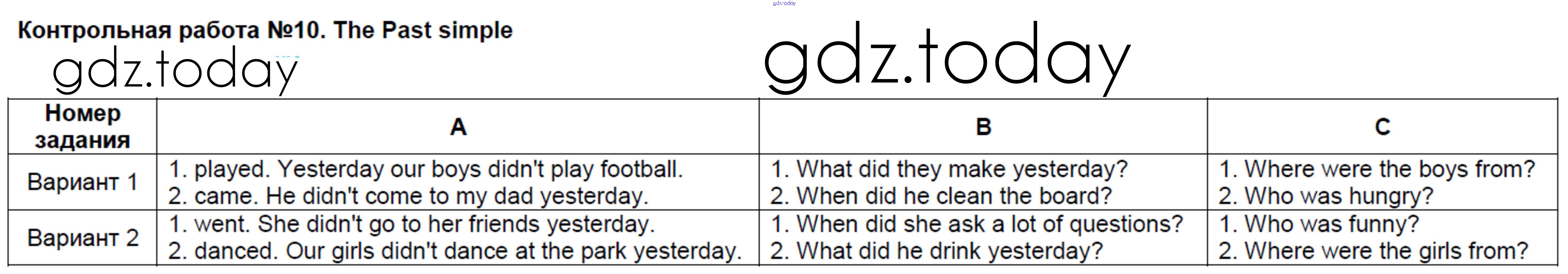 На страницах сайта gdz.today вы найдете учебный и вспомогательный материал, направленный на улучшения знаний школьной программы. ГДЗ - онлайн мир знаний Решение к контрольным работам КР №10. The Past simple Контрольно-измерительным материалам (КИМ) по Английскому языку для 4 класса Кулинич ВАКО 2018