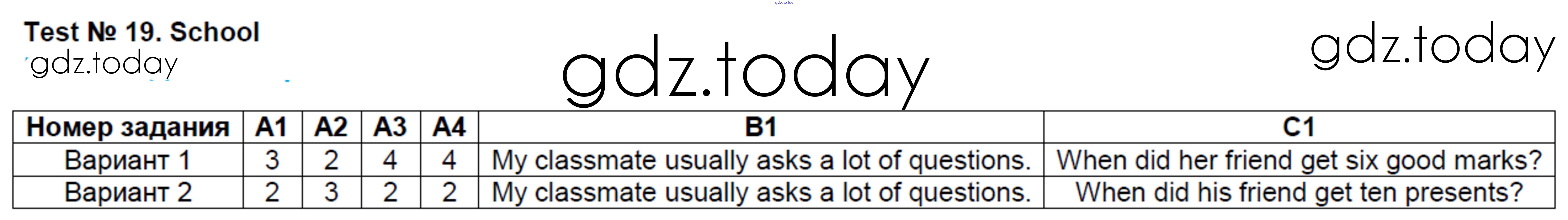 На страницах сайта gdz.today вы найдете учебный и вспомогательный материал, направленный на улучшения знаний школьной программы. ГДЗ - онлайн мир знаний Решение к тестам Тест №19. School Контрольно-измерительным материалам (КИМ) по Английскому языку для 4 класса Кулинич ВАКО 2018