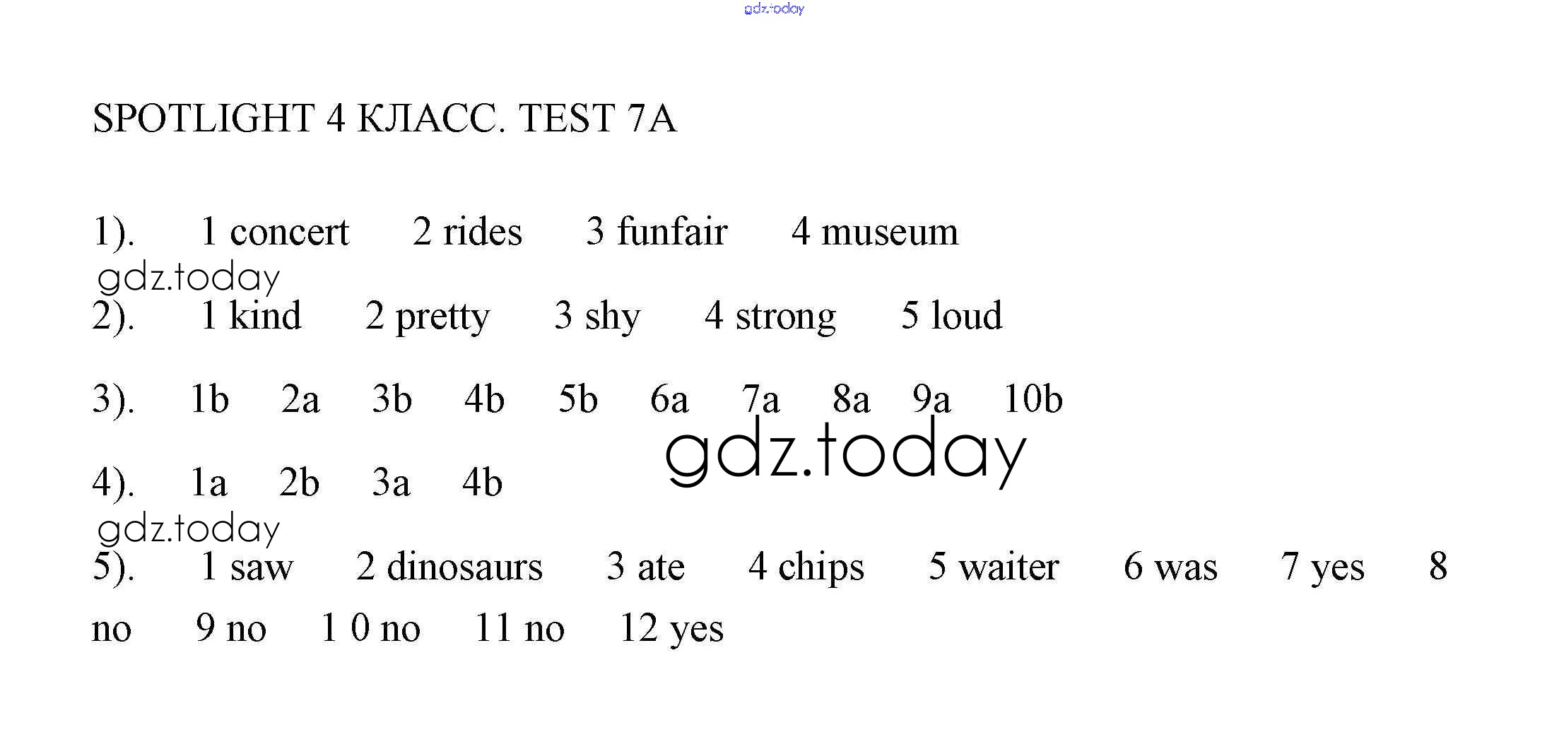 На страницах сайта gdz.today вы найдете учебный и вспомогательный материал, направленный на улучшения знаний школьной программы. ГДЗ - онлайн мир знаний Решение. Контрольная работа 7 7A Контрольным работам по Английскому языку для 4 класса Быкова, Эванс Просвещение Spotlight 2018