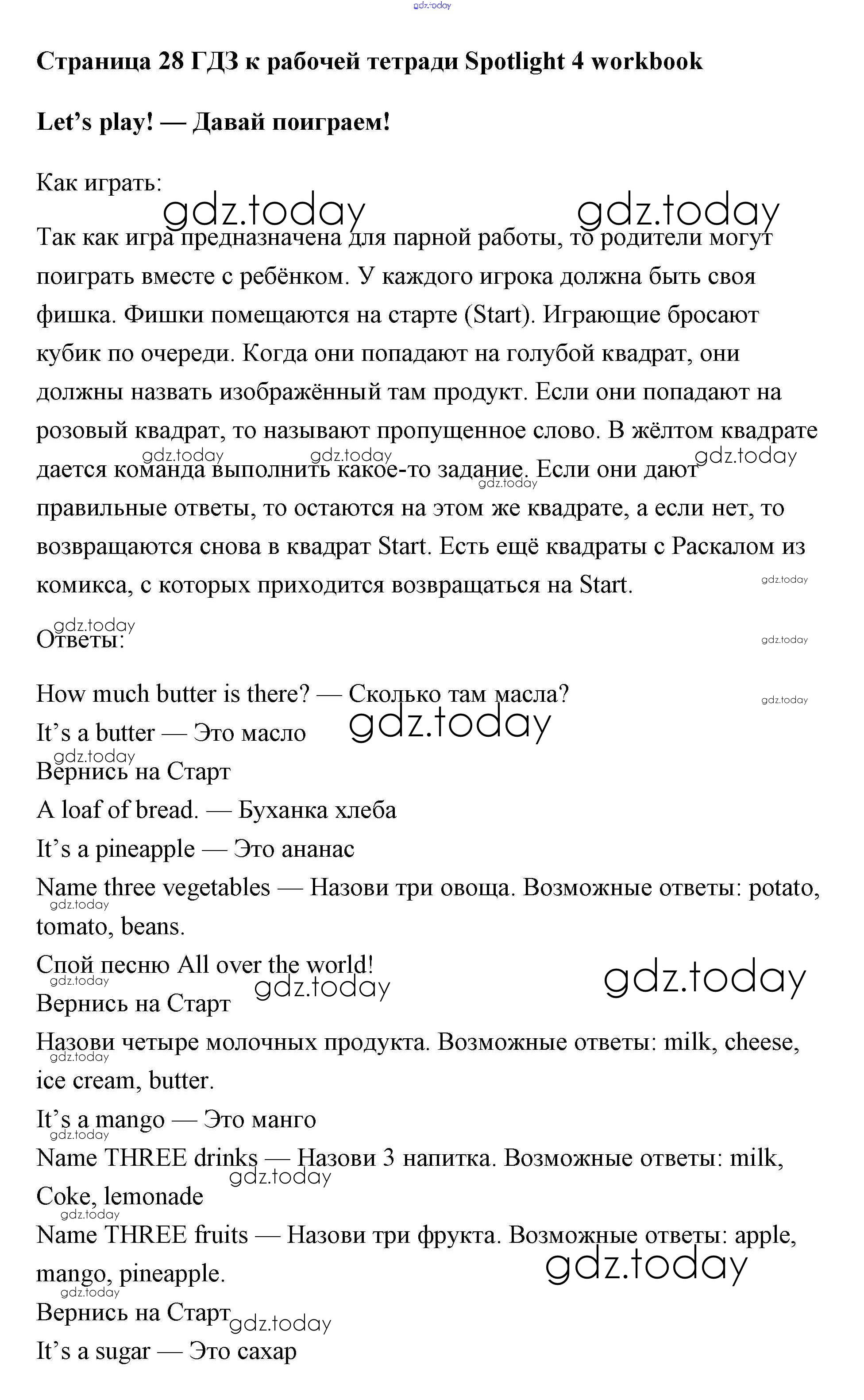 На страницах сайта gdz.today вы найдете учебный и вспомогательный материал, направленный на улучшения знаний школьной программы. ГДЗ - онлайн мир знаний Let`s play Решение к Module 3 страница 28 Рабочей тетради по Английскому языку для 4 класса Быкова, Эванс Просвещение Spotlight 2017