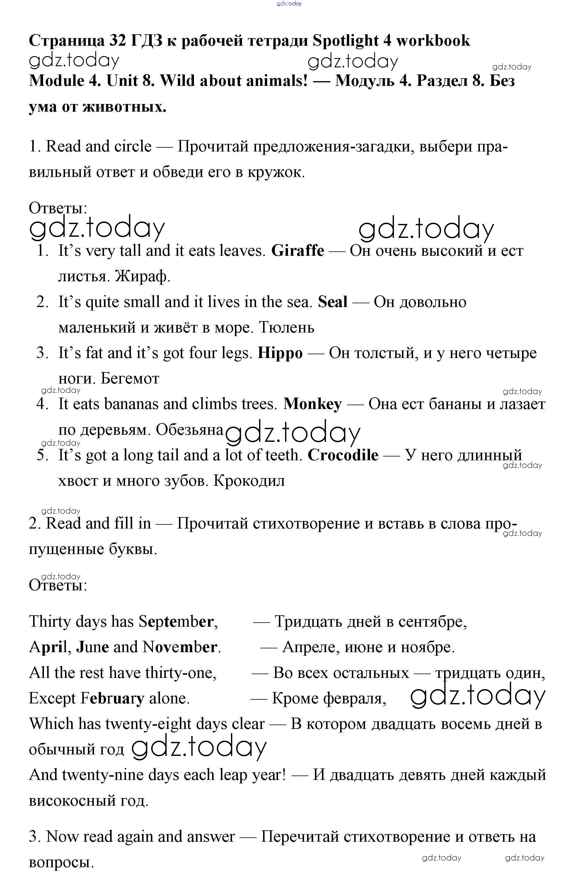 На страницах сайта gdz.today вы найдете учебный и вспомогательный материал, направленный на улучшения знаний школьной программы. ГДЗ - онлайн мир знаний Unit 8 Решение к Module 4 страница 32 Рабочей тетради по Английскому языку для 4 класса Быкова, Эванс Просвещение Spotlight 2017
