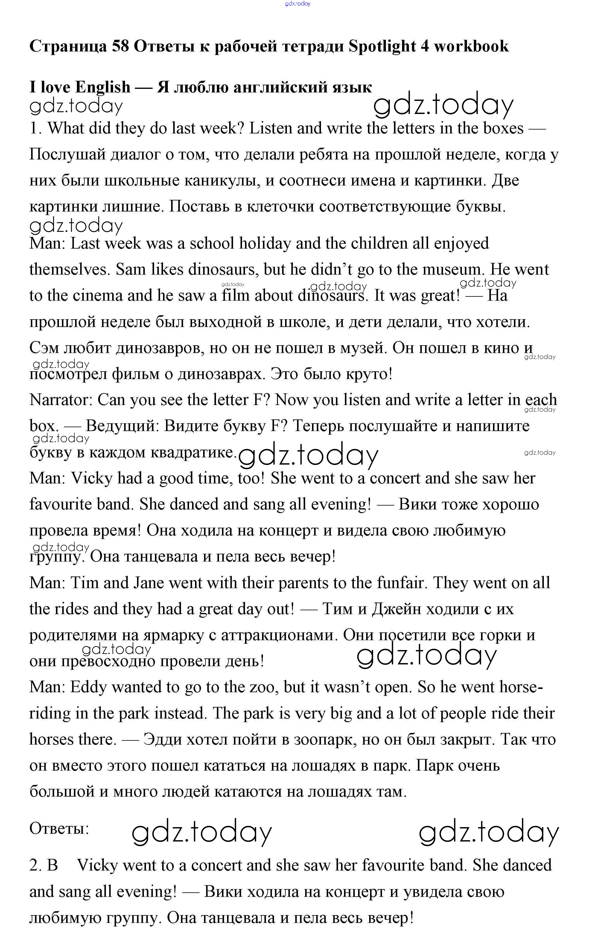 Ответы к I love English Решение к Module 7 страница 58 Рабочей тетради по Английскому языку для 4 класса Быкова, Эванс Просвещение Spotlight 2017