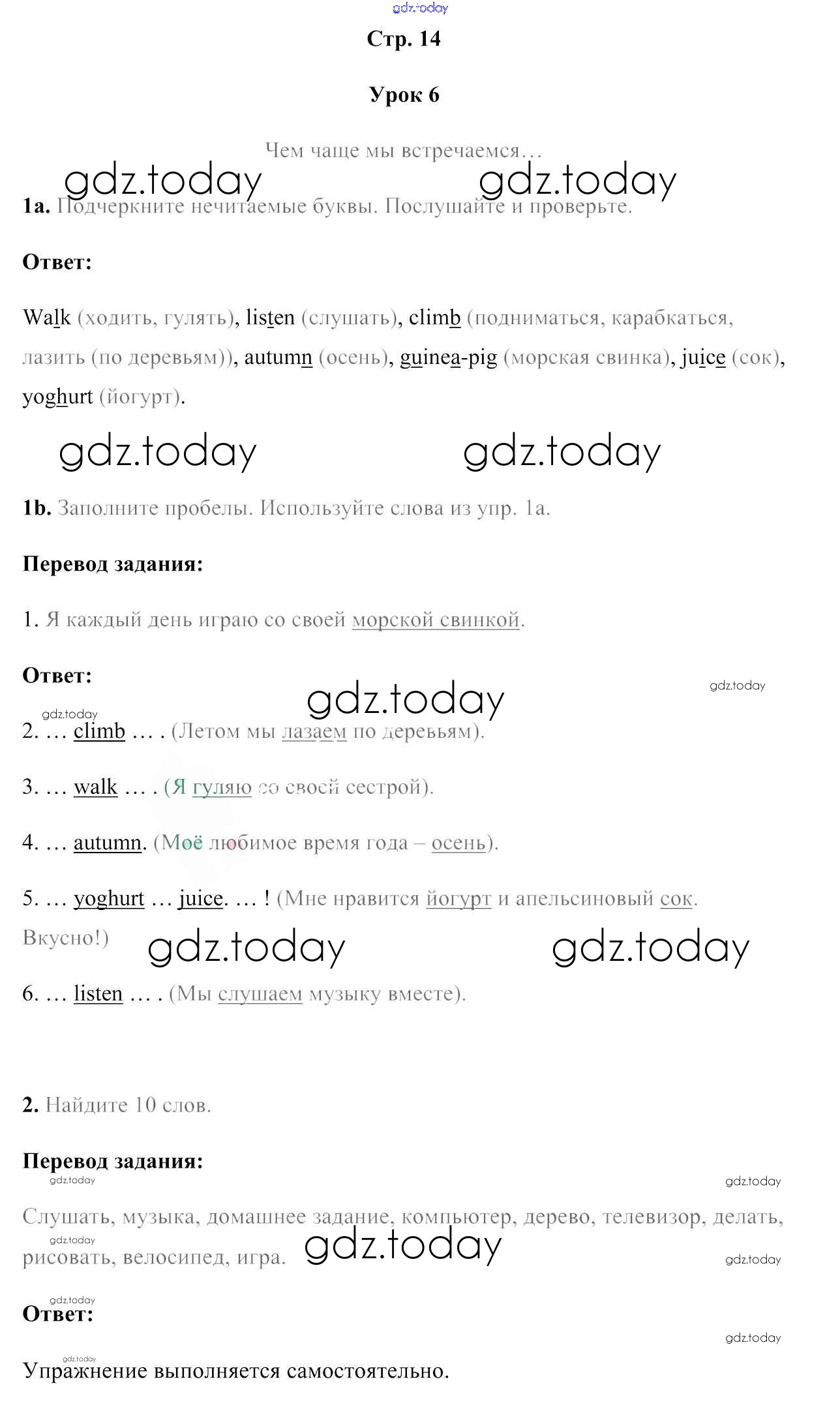 На страницах сайта gdz.today вы найдете учебный и вспомогательный материал, направленный на улучшения знаний школьной программы. ГДЗ - онлайн мир знаний Решение к части 1. Страницы 14 Рабочей тетради по Английскому языку для 4 класса Лапицкая, Калишевич Аверсэв 2019