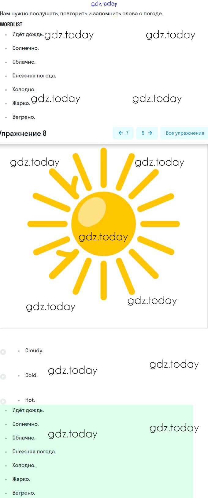 На страницах сайта gdz.today вы найдете учебный и вспомогательный материал, направленный на улучшения знаний школьной программы. ГДЗ - онлайн мир знаний Решение. Раздел 7. Погода 8 Учебнику по Английскому языку для 4 класса Комарова, Ларионова Русское слово Brilliant 2020