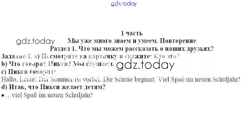 На страницах сайта gdz.today вы найдете учебный и вспомогательный материал, направленный на улучшения знаний школьной программы. ГДЗ - онлайн мир знаний Раздел 1 Мы уже много знаем и умеем. Повторение 1 Учебнику по Немецкому языку для 4 класса Бим Просвещение Академический школьный учебник 2014
