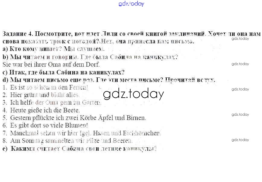 На страницах сайта gdz.today вы найдете учебный и вспомогательный материал, направленный на улучшения знаний школьной программы. ГДЗ - онлайн мир знаний Раздел 1 Решение к главе 1. Как было летом 4 Учебнику по Немецкому языку для 4 класса Бим Просвещение Академический школьный учебник 2014
