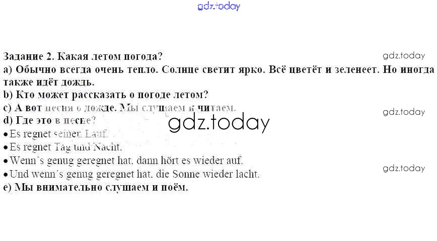 На страницах сайта gdz.today вы найдете учебный и вспомогательный материал, направленный на улучшения знаний школьной программы. ГДЗ - онлайн мир знаний Раздел 4 Решение к главе 1. Как было летом 2 Учебнику по Немецкому языку для 4 класса Бим Просвещение Академический школьный учебник 2014