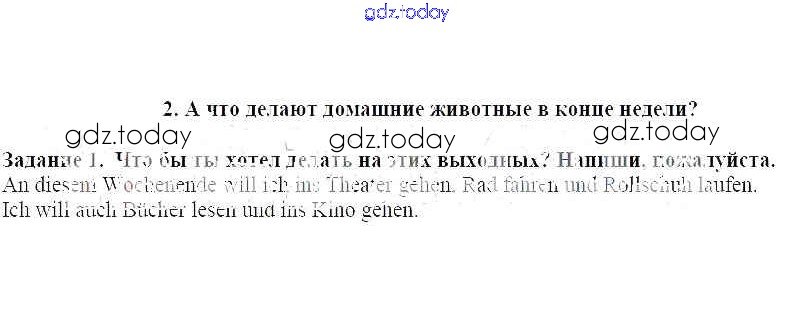 На страницах сайта gdz.today вы найдете учебный и вспомогательный материал, направленный на улучшения знаний школьной программы. ГДЗ - онлайн мир знаний А что делают домашние животные в конце недели Решение к теме "Свободное время … Чем мы занимаемся" 1 Рабочей тетради по Немецкому языку для 4 класса Бим, Рыжова Просвещение 2020