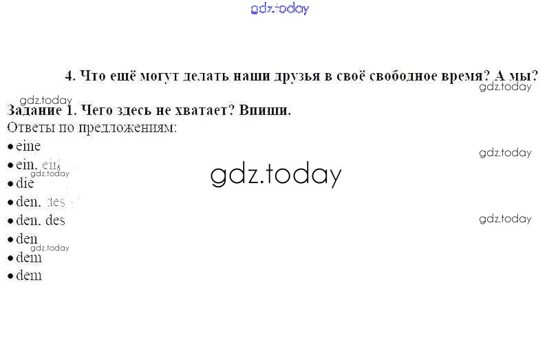 На страницах сайта gdz.today вы найдете учебный и вспомогательный материал, направленный на улучшения знаний школьной программы. ГДЗ - онлайн мир знаний Что ещё могут делать наши друзья в своё свободное время А мы Решение к теме "Свободное время … Чем мы занимаемся" 1 Рабочей тетради по Немецкому языку для 4 класса Бим, Рыжова Просвещение 2020