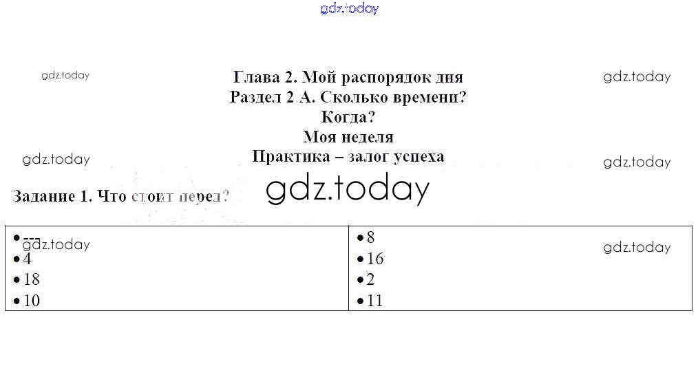 На страницах сайта gdz.today вы найдете учебный и вспомогательный материал, направленный на улучшения знаний школьной программы. ГДЗ - онлайн мир знаний Раздел 2 A. Сколько времени Решение к главе 2. Мой распорядок дня 1 Учебнику по Немецкому языку для 4 класса Гальскова, Гез Дрофа Ритм 2014