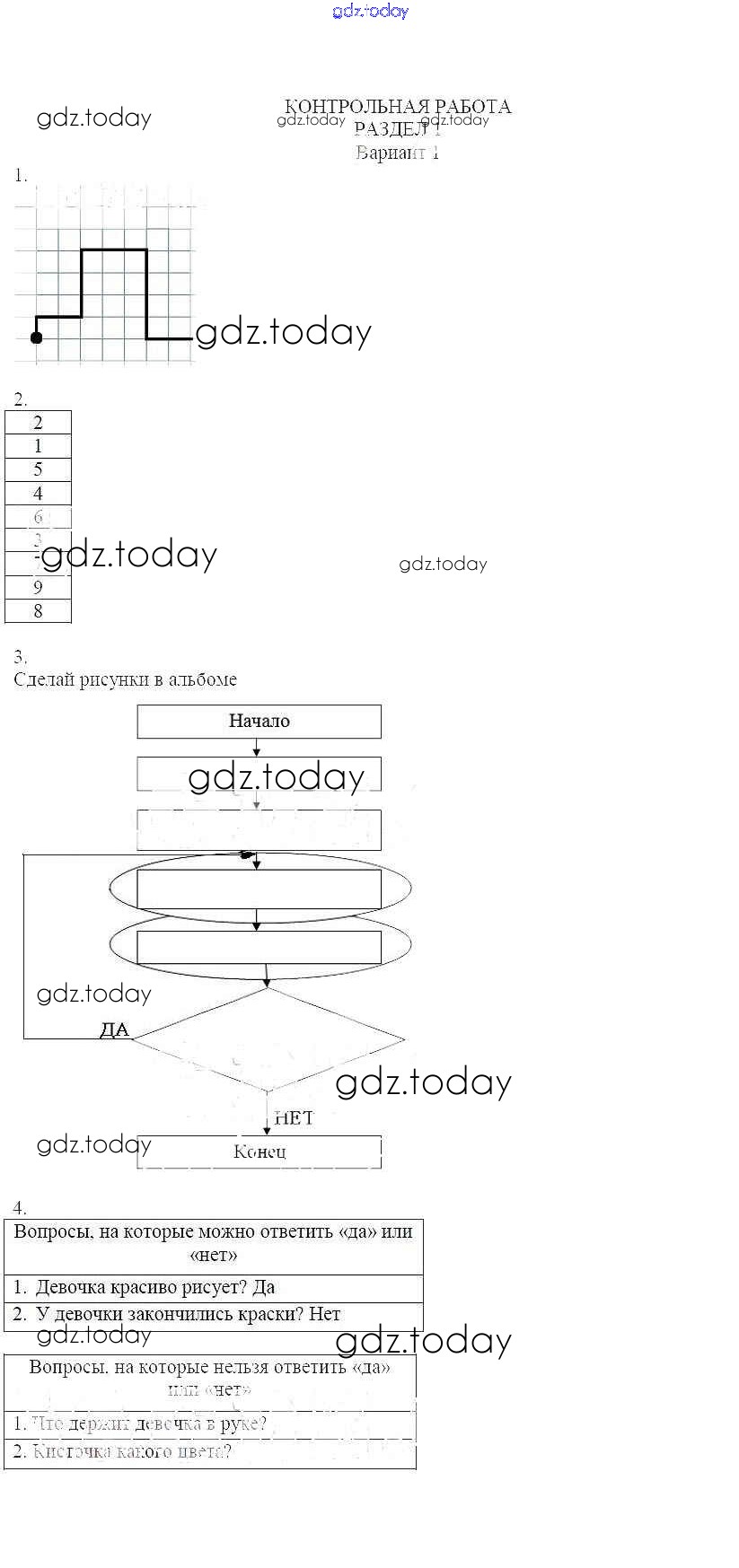 На страницах сайта gdz.today вы найдете учебный и вспомогательный материал, направленный на улучшения знаний школьной программы. ГДЗ - онлайн мир знаний Контрольная работа 1 Решение к разделу 1 Вариант 1 Учебнику по Информатике для 4 класса Горячев, Горина Баласс Школа 2100 2010