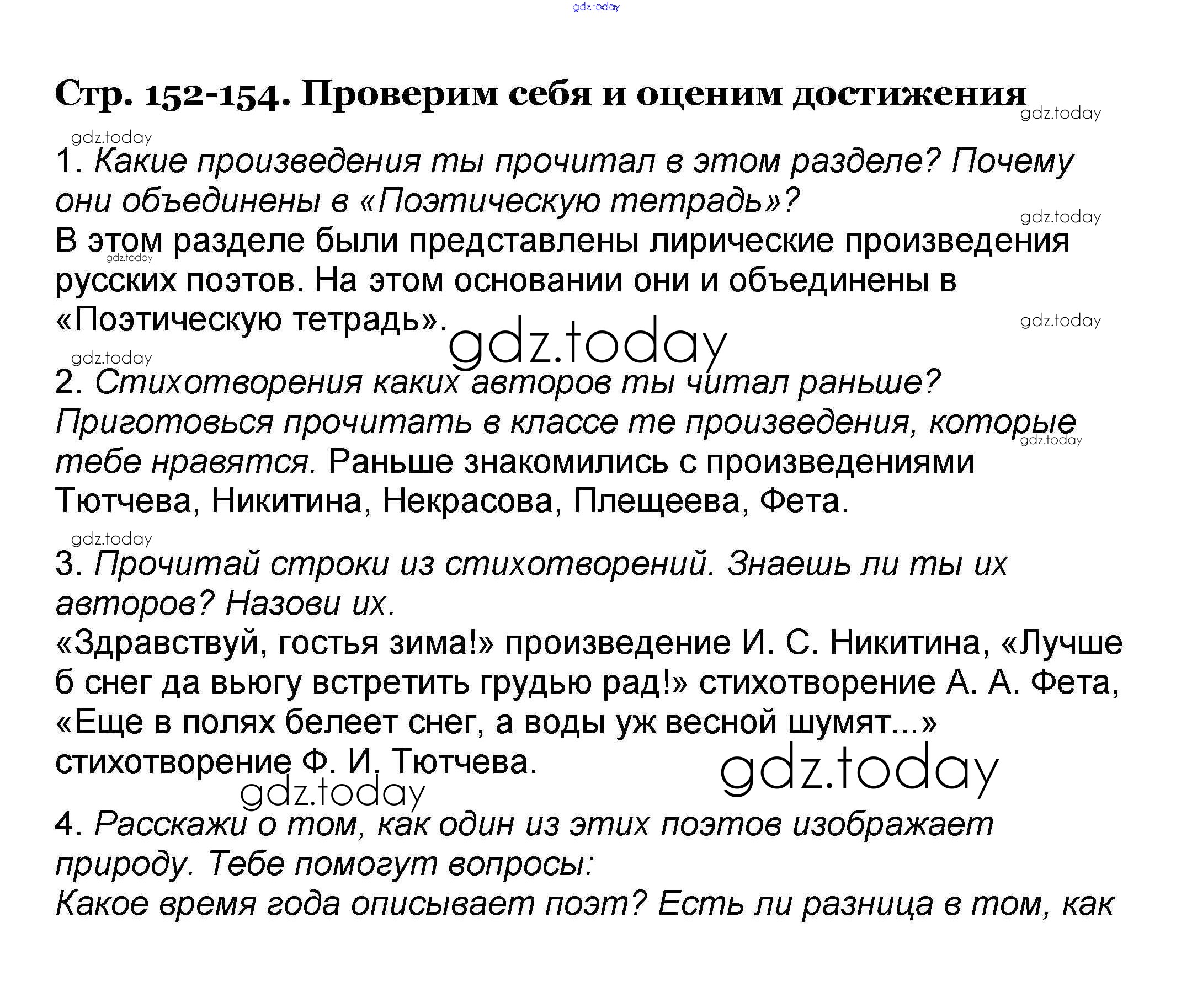 На страницах сайта gdz.today вы найдете учебный и вспомогательный материал, направленный на улучшения знаний школьной программы. ГДЗ - онлайн мир знаний Решение к части 1. Страницы 152-154 Учебнику по Литературному чтению для 4 класса Климанова, Горецкий Просвещение Школа России 2018