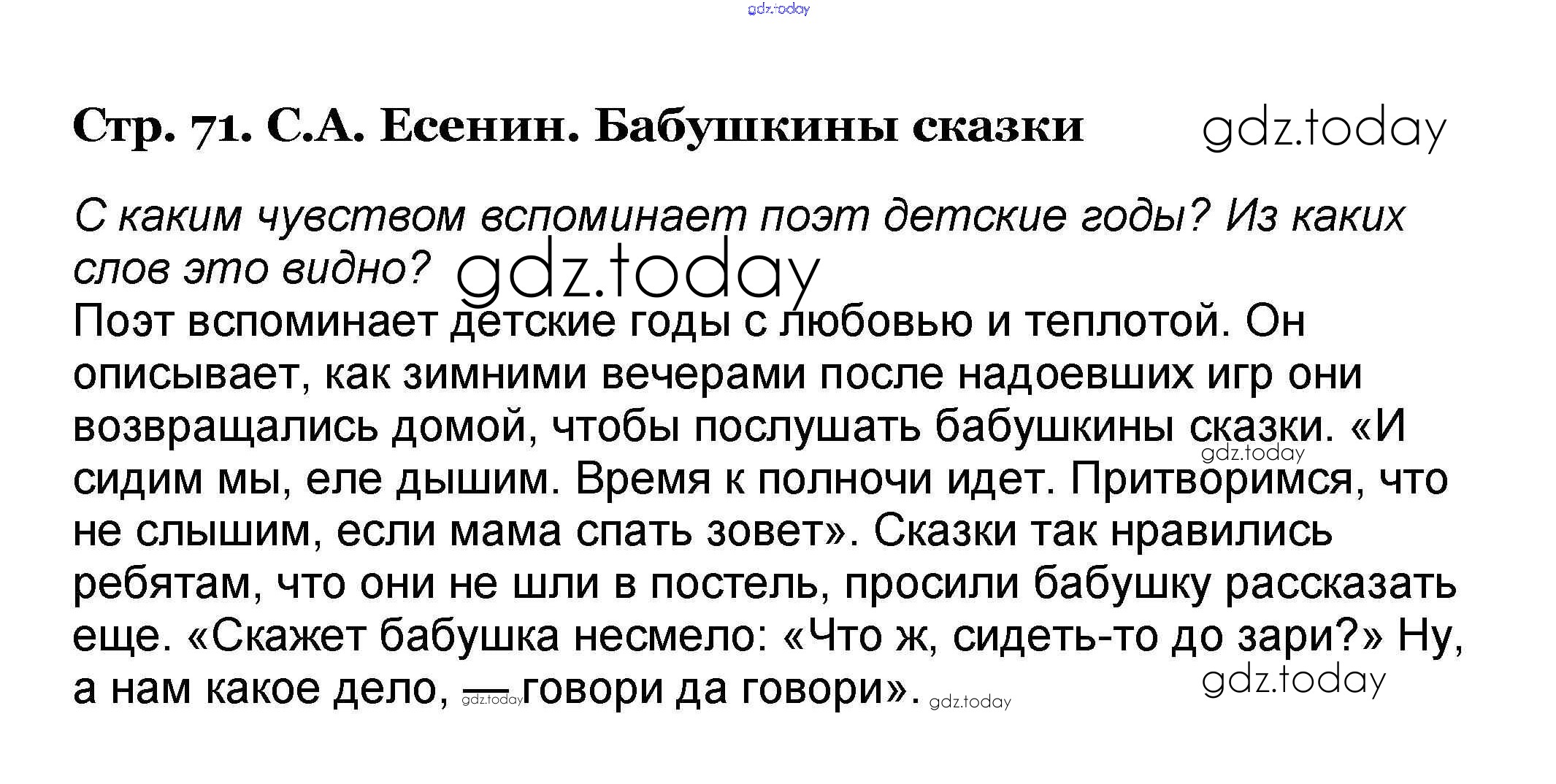 На страницах сайта gdz.today вы найдете учебный и вспомогательный материал, направленный на улучшения знаний школьной программы. ГДЗ - онлайн мир знаний Решение к части 2. Страницы 71 Учебнику по Литературному чтению для 4 класса Климанова, Горецкий Просвещение Школа России 2018