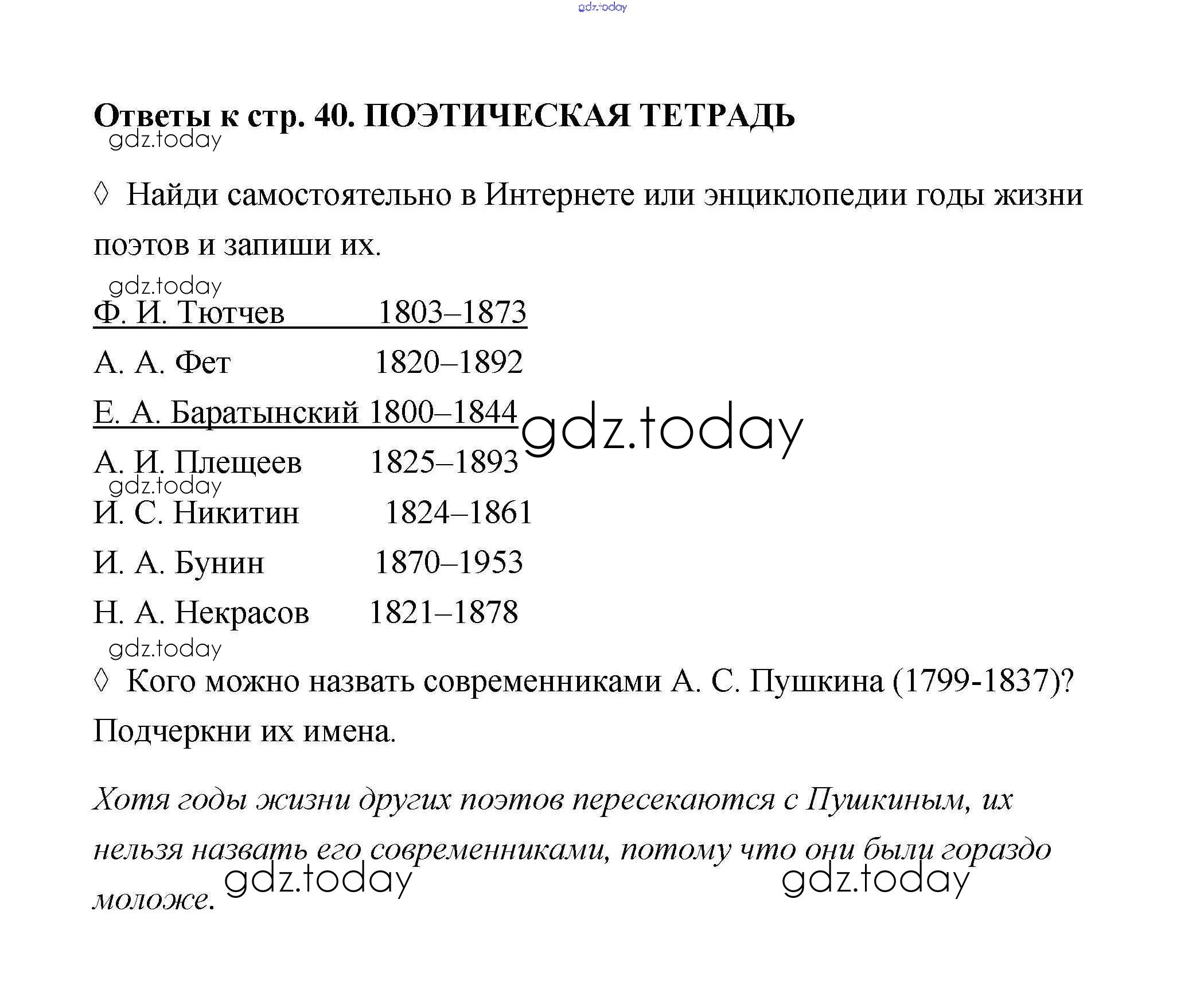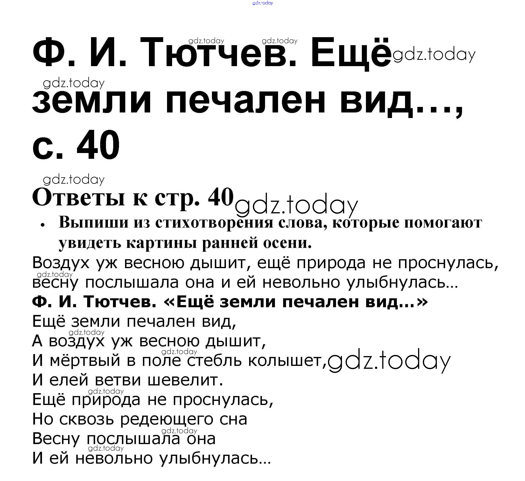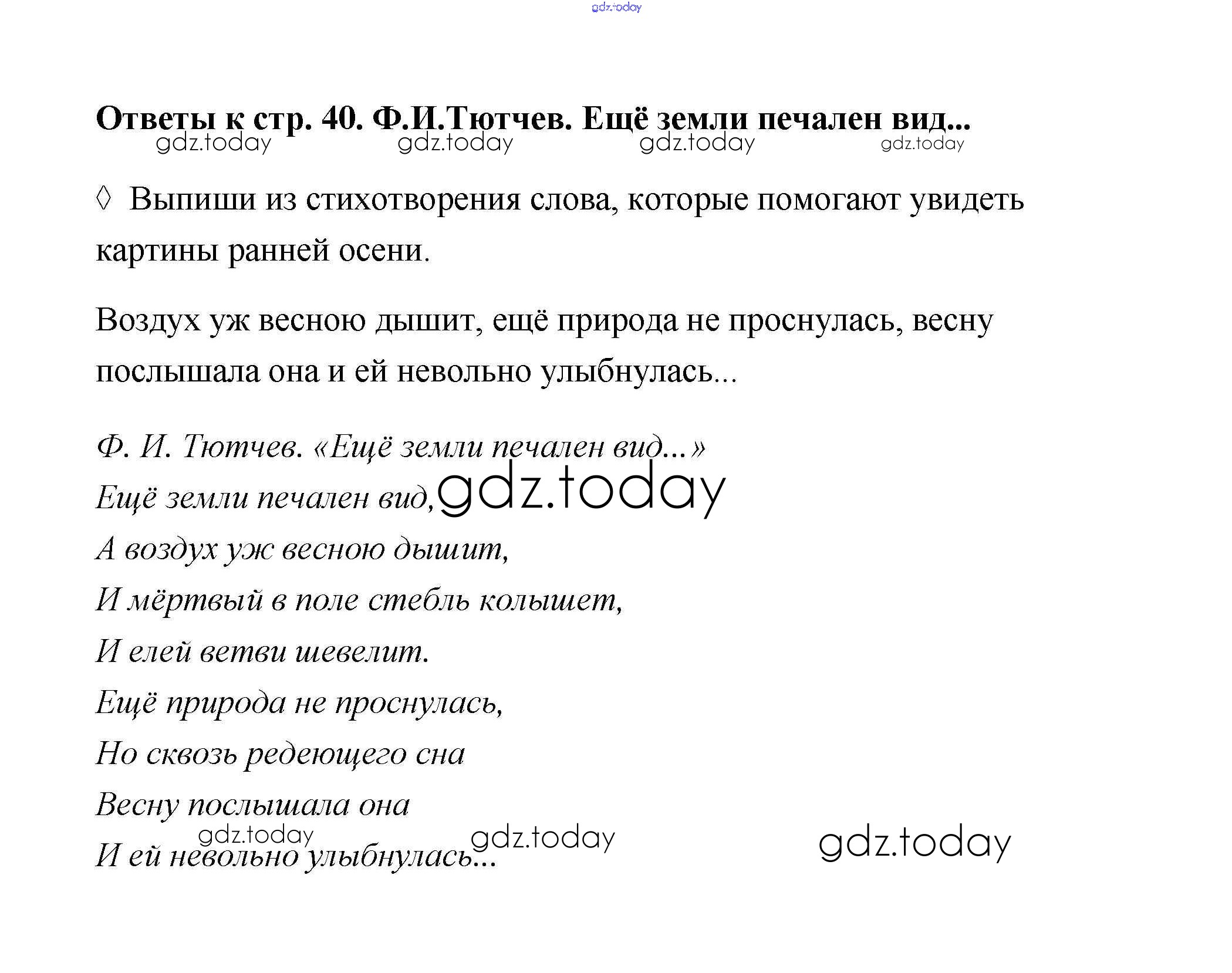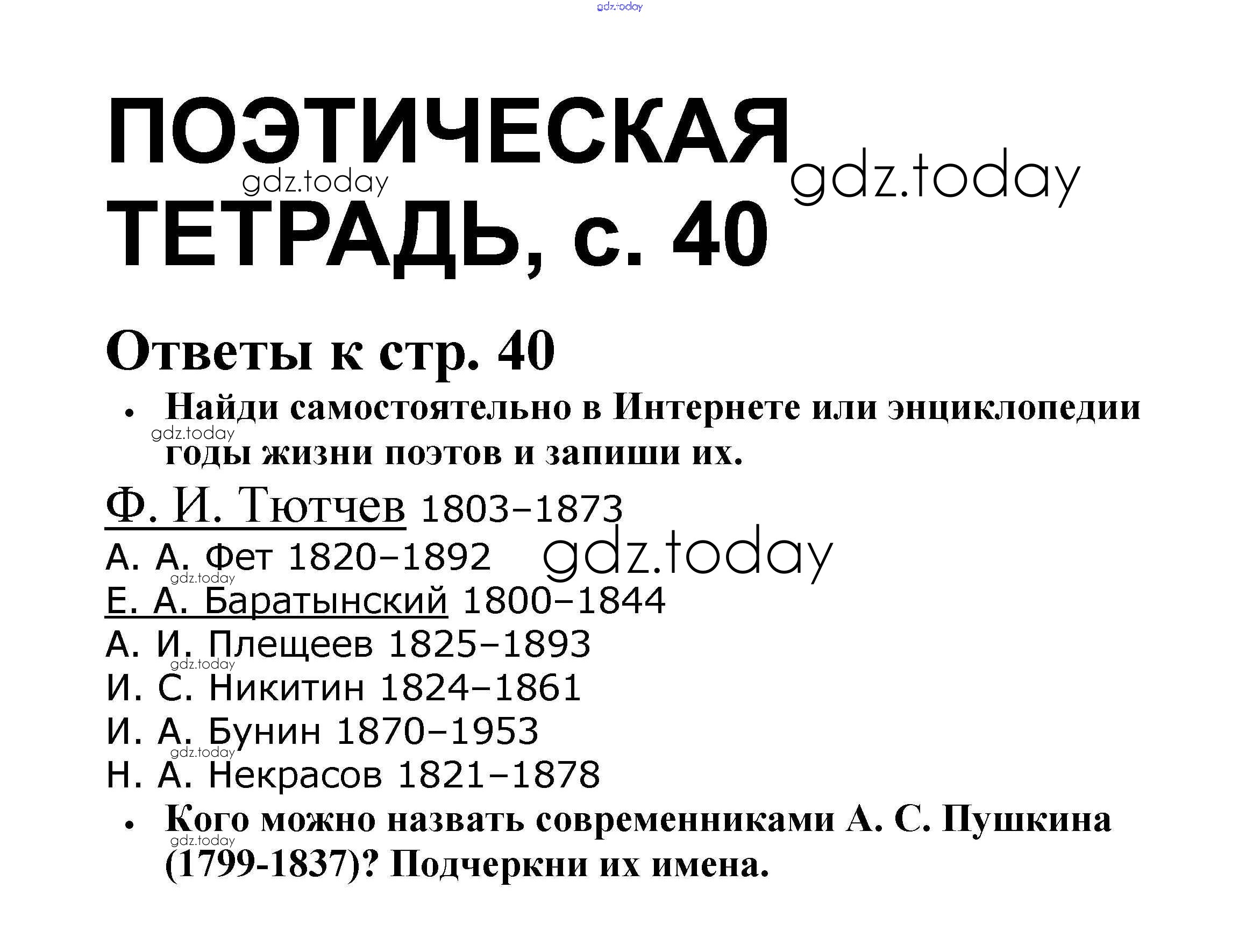 На страницах сайта gdz.today вы найдете учебный и вспомогательный материал, направленный на улучшения знаний школьной программы. ГДЗ - онлайн мир знаний Решение к страницам 40 Рабочей тетради по Литературному чтению для 4 класса Бойкина, Виноградская Просвещение Школа России 2016
