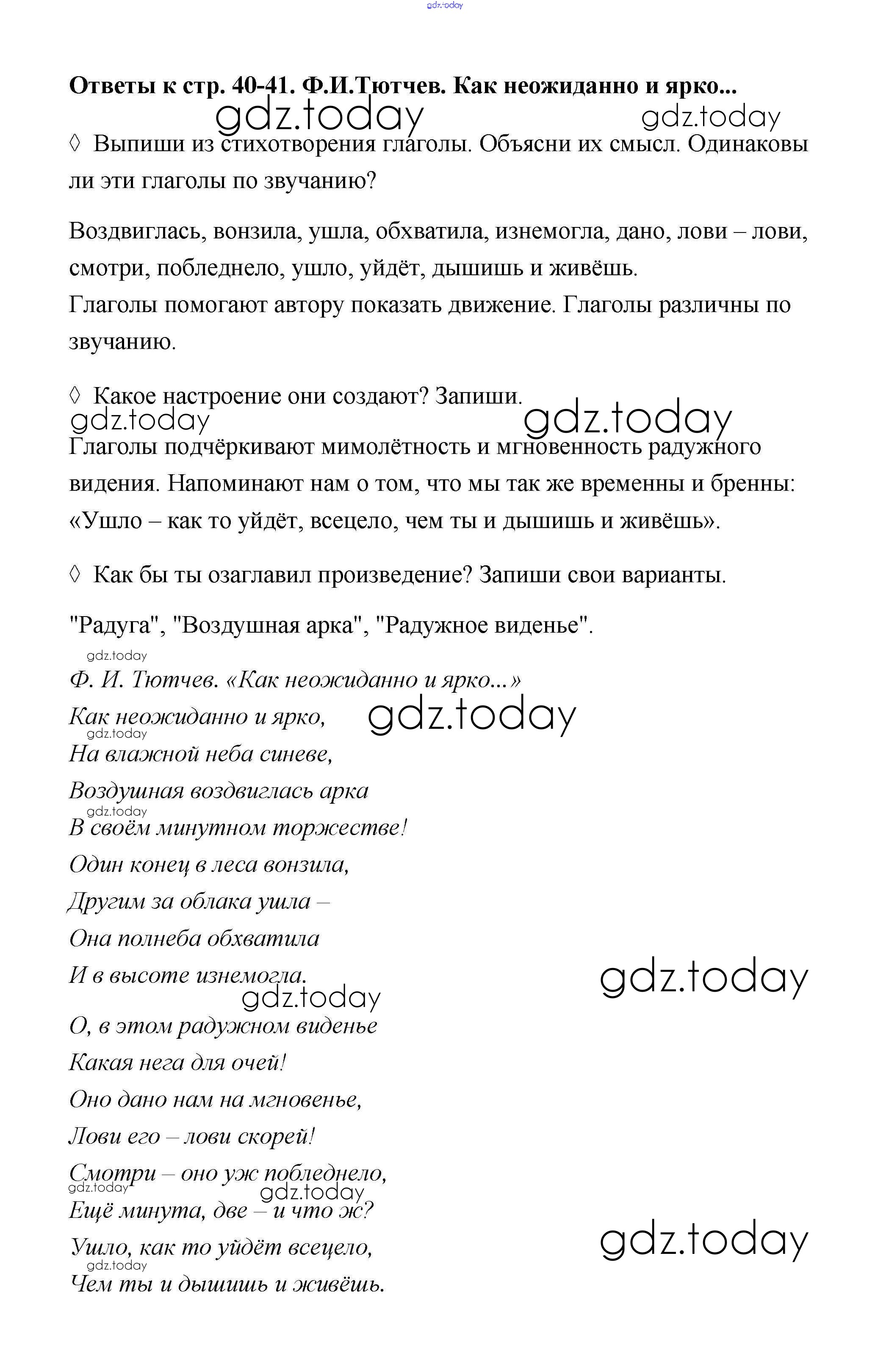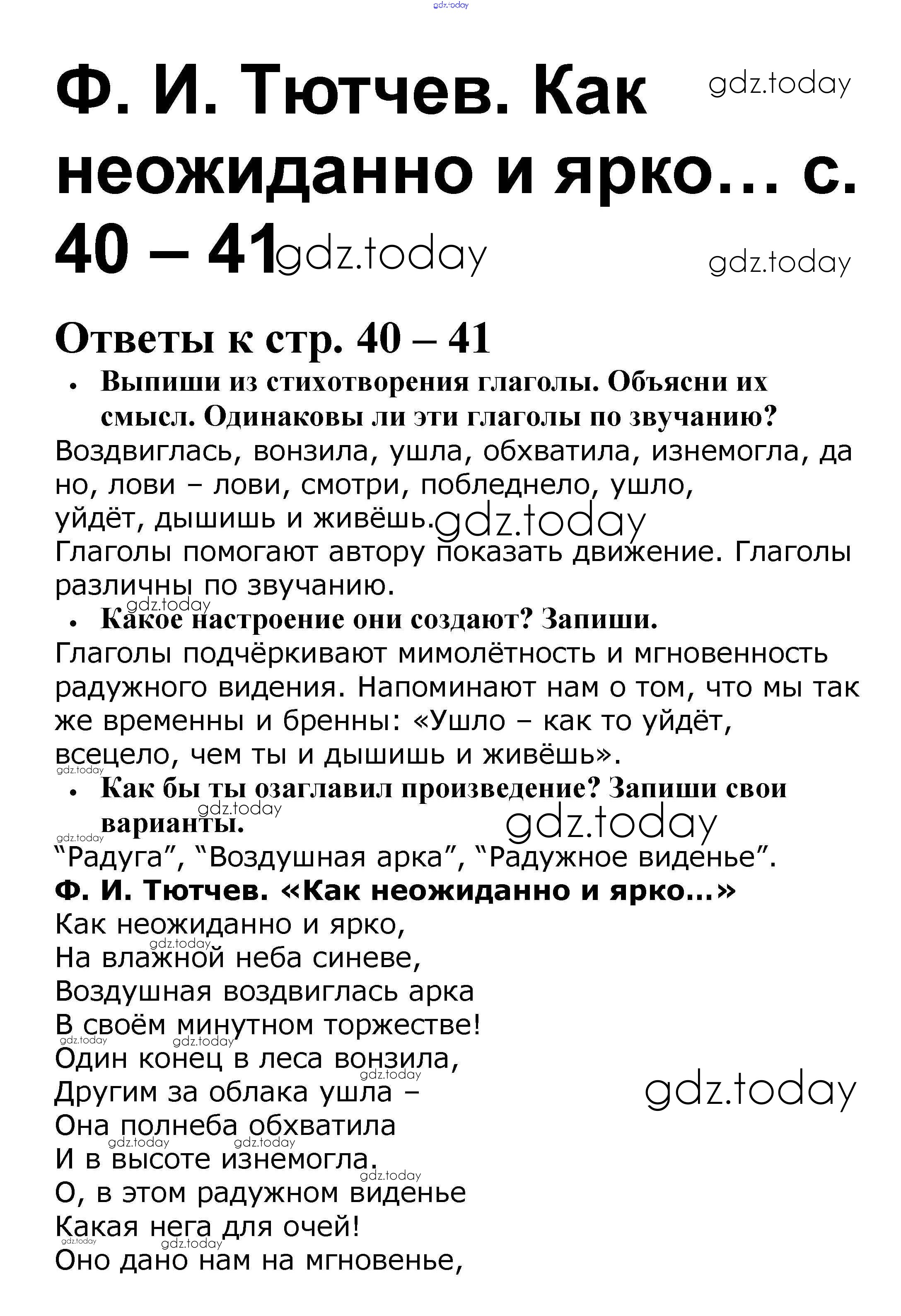 На страницах сайта gdz.today вы найдете учебный и вспомогательный материал, направленный на улучшения знаний школьной программы. ГДЗ - онлайн мир знаний Решение к страницам 40-41 Рабочей тетради по Литературному чтению для 4 класса Бойкина, Виноградская Просвещение Школа России 2016