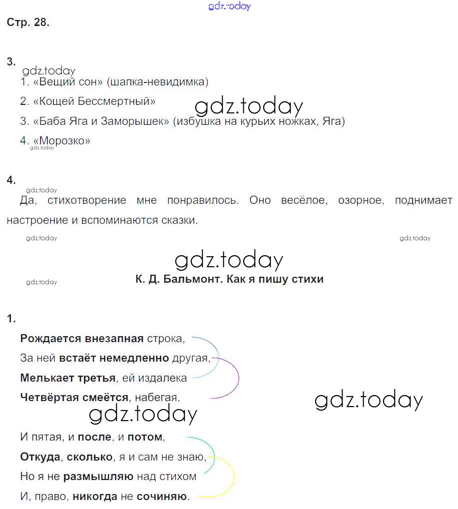 На страницах сайта gdz.today вы найдете учебный и вспомогательный материал, направленный на улучшения знаний школьной программы. ГДЗ - онлайн мир знаний Решение к части 2. Страницы 28 Рабочей тетради по Литературному чтению для 4 класса Ефросинина Вентана-граф Начальная школа XXI века 2020