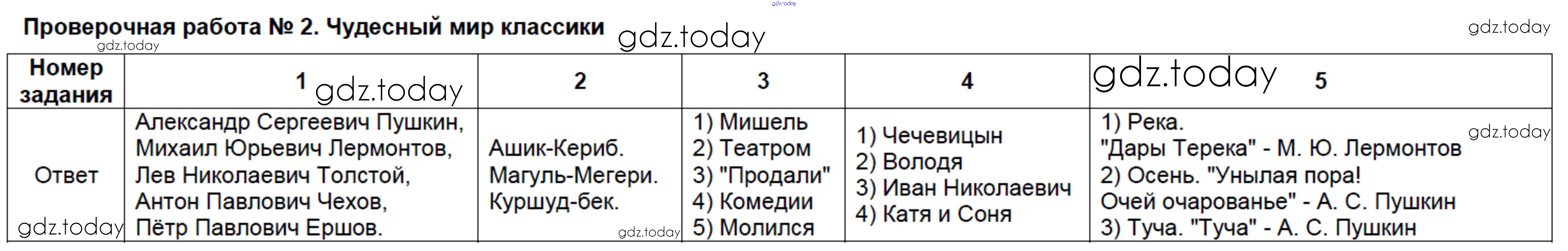 На страницах сайта gdz.today вы найдете учебный и вспомогательный материал, направленный на улучшения знаний школьной программы. ГДЗ - онлайн мир знаний Решение к проверочным работам ПР-2. Чудесный мир классики Контрольно-измерительным материалам (КИМ) по Литературному чтению для 4 класса Шубина Экзамен 2014