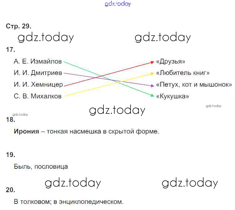 На страницах сайта gdz.today вы найдете учебный и вспомогательный материал, направленный на улучшения знаний школьной программы. ГДЗ - онлайн мир знаний Решение к части 1. Страницы тетради 29 Тетради для контрольных работ по Литературному чтению для 4 класса Ефросинина Вентана-граф УМК 2019