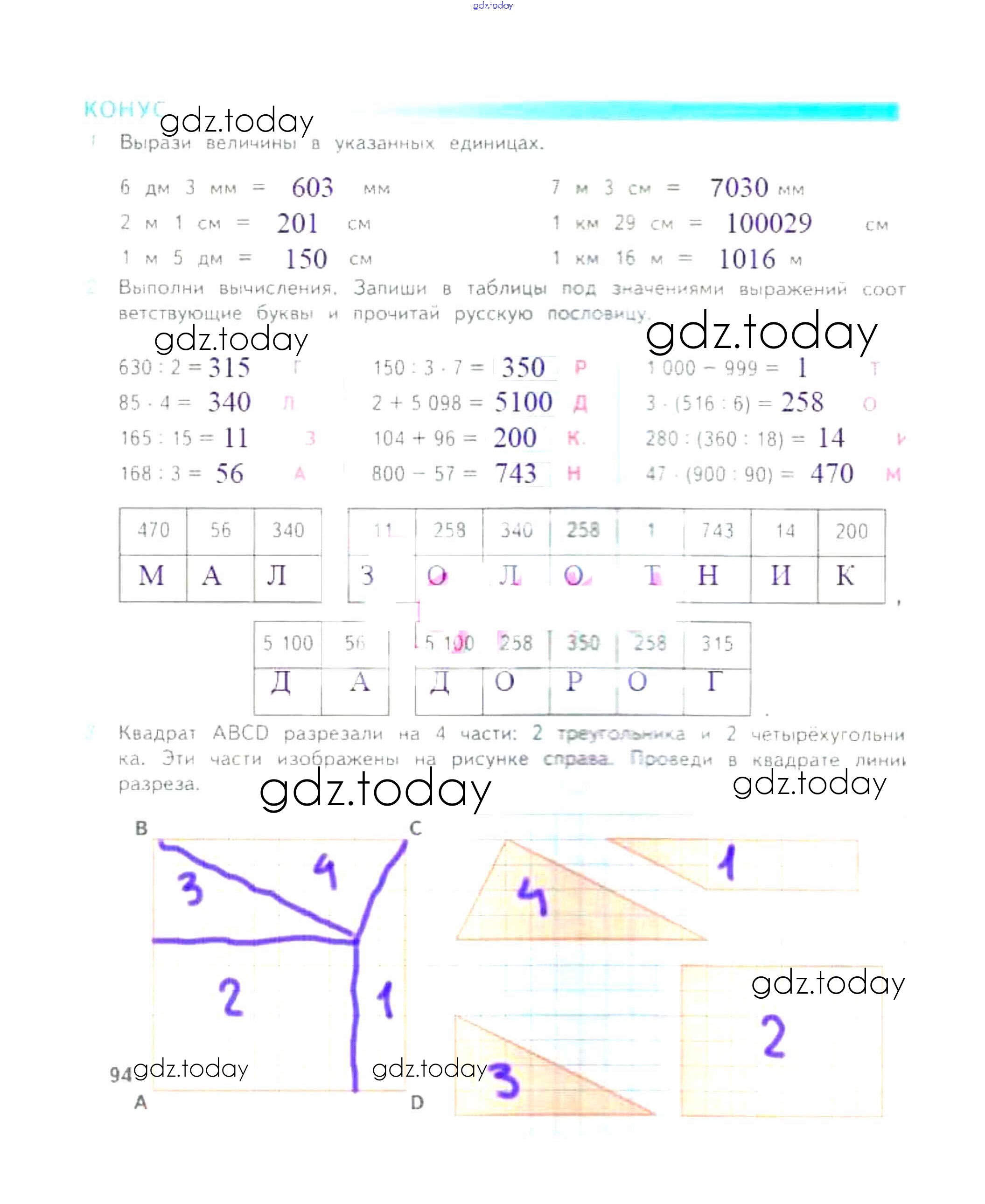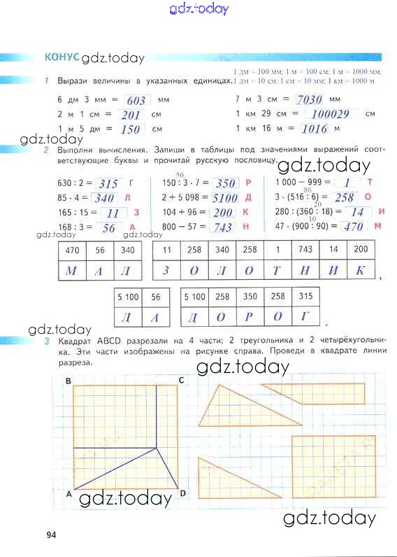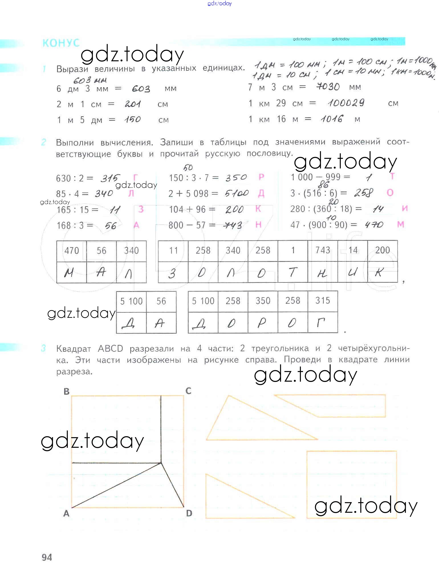 На страницах сайта gdz.today вы найдете учебный и вспомогательный материал, направленный на улучшения знаний школьной программы. ГДЗ - онлайн мир знаний Решение к части 1. Страницы 94 Рабочей тетради по Математике для 4 класса Дорофеев, Миракова Просвещение Перспектива 2017