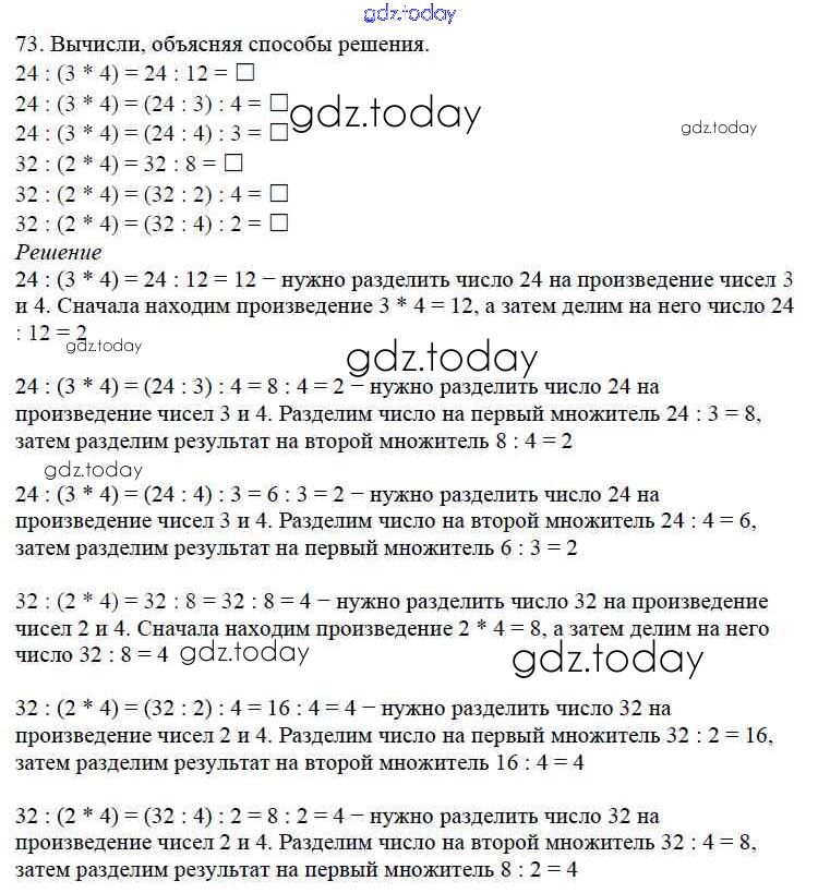 На страницах сайта gdz.today вы найдете учебный и вспомогательный материал, направленный на улучшения знаний школьной программы. ГДЗ - онлайн мир знаний Упражнения Решение к части 2 73 Учебнику по Математике для 4 класса Моро, Бантова Просвещение Школа России 2015