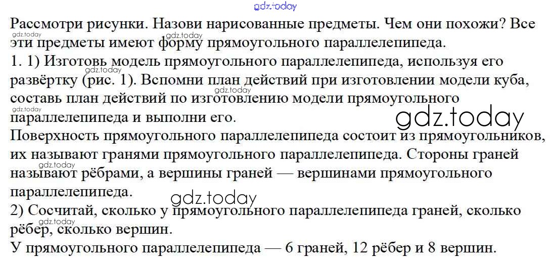 На страницах сайта gdz.today вы найдете учебный и вспомогательный материал, направленный на улучшения знаний школьной программы. ГДЗ - онлайн мир знаний Прямоугольный параллелепипед (стр. 111) Итоговое повторение 1 Учебнику по Математике для 4 класса Моро, Бантова Просвещение Школа России 2015