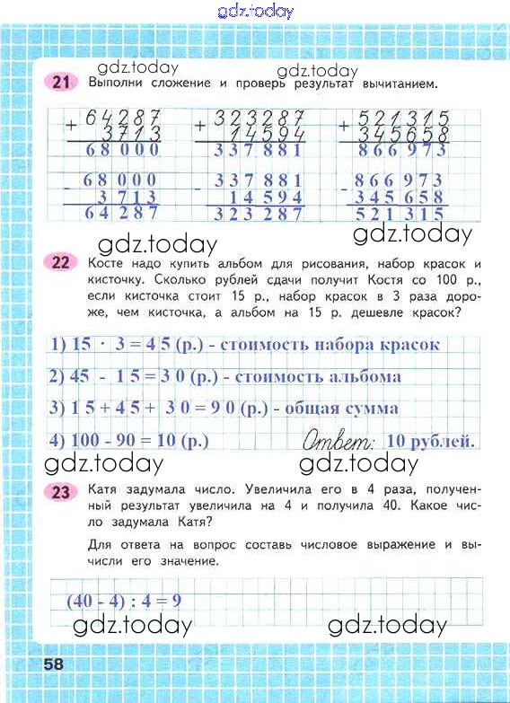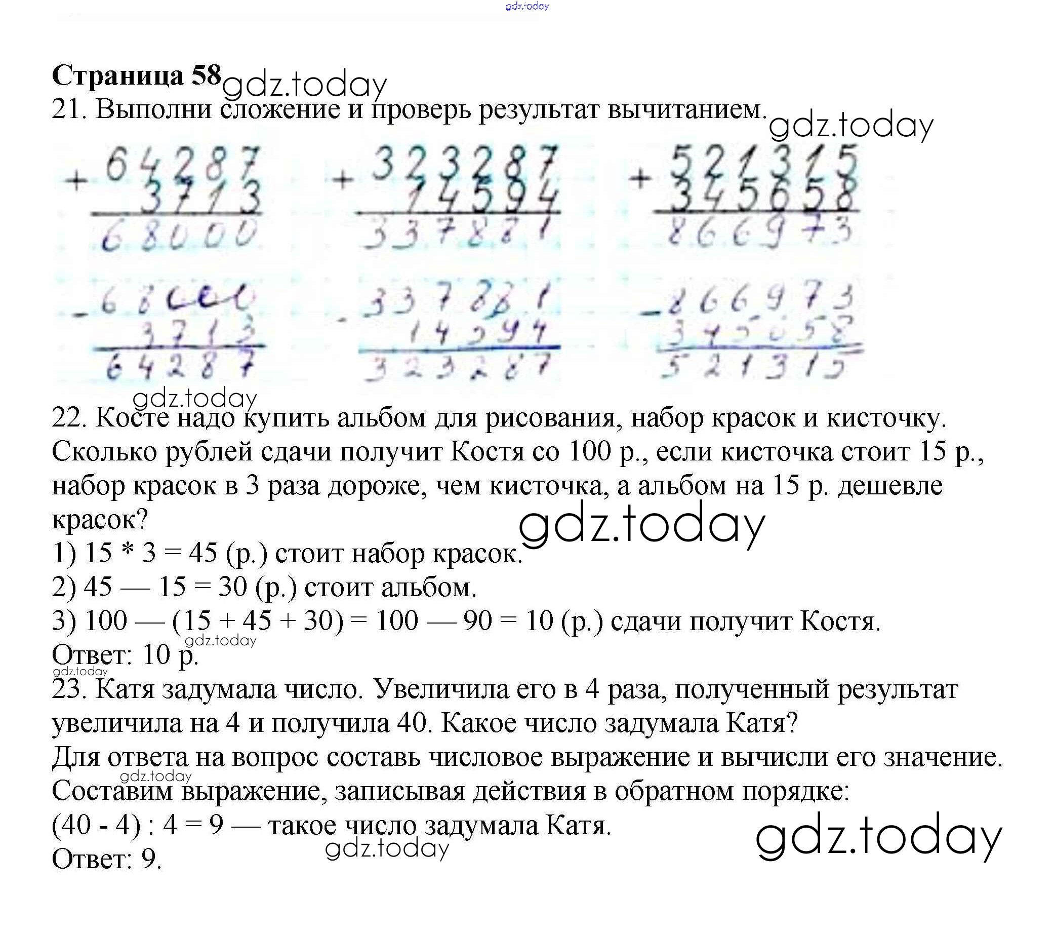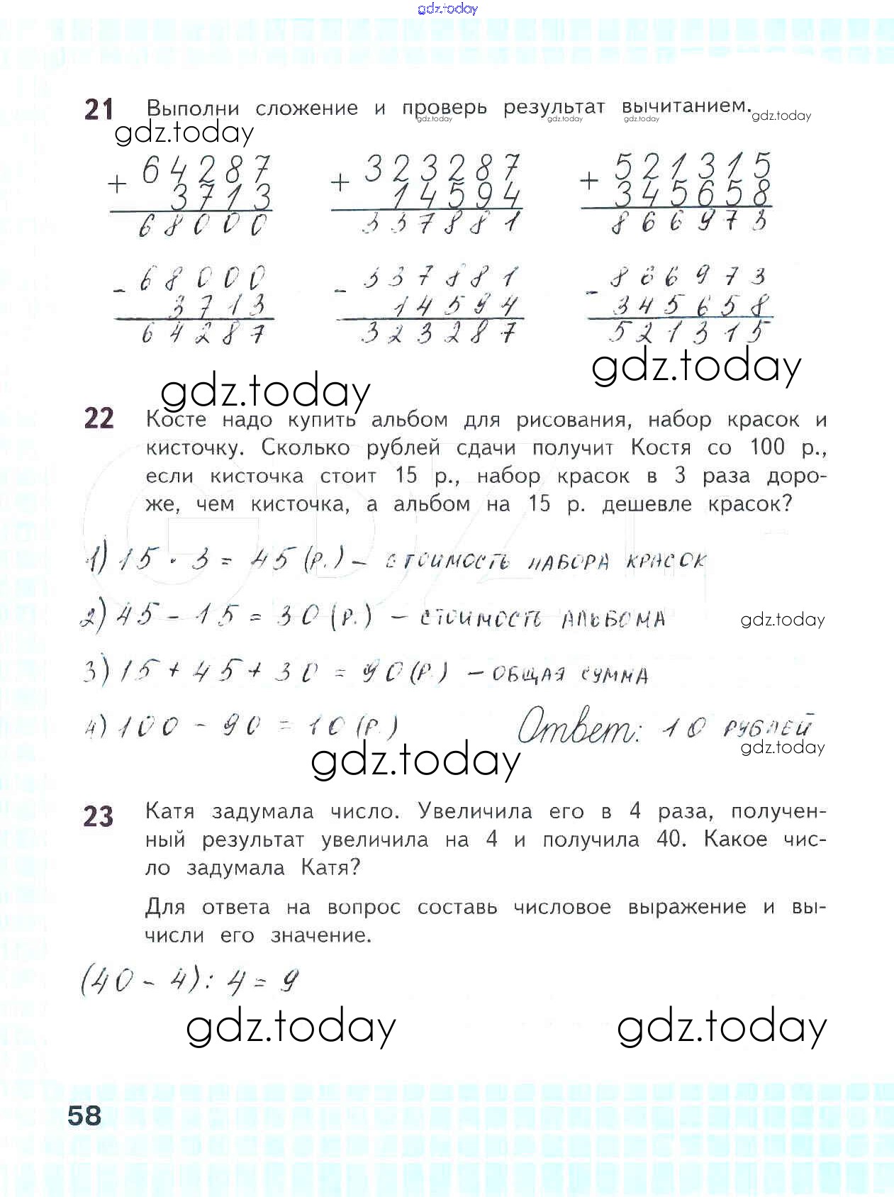 На страницах сайта gdz.today вы найдете учебный и вспомогательный материал, направленный на улучшения знаний школьной программы. ГДЗ - онлайн мир знаний Решение к части 1. Страницы 58 Рабочей тетради по Математике для 4 класса Волкова Просвещение Школа России 2016