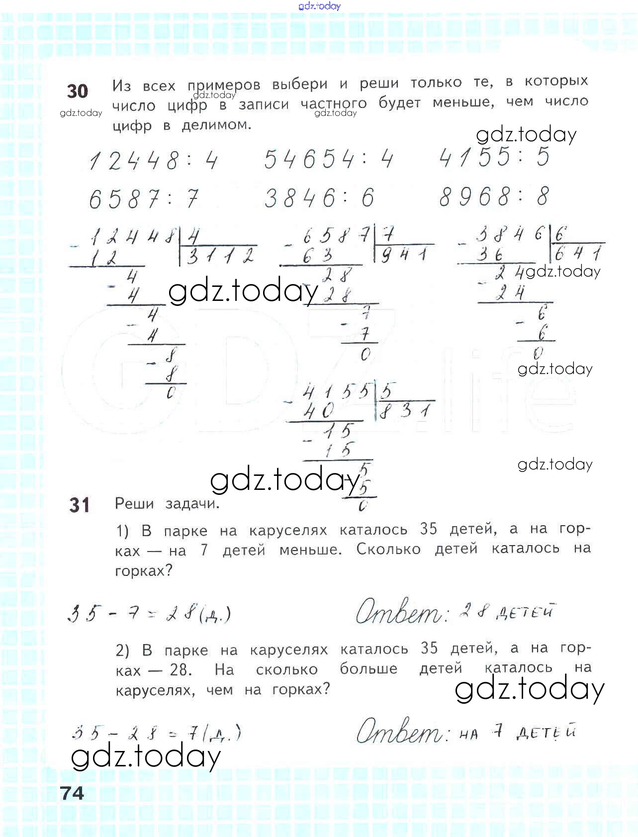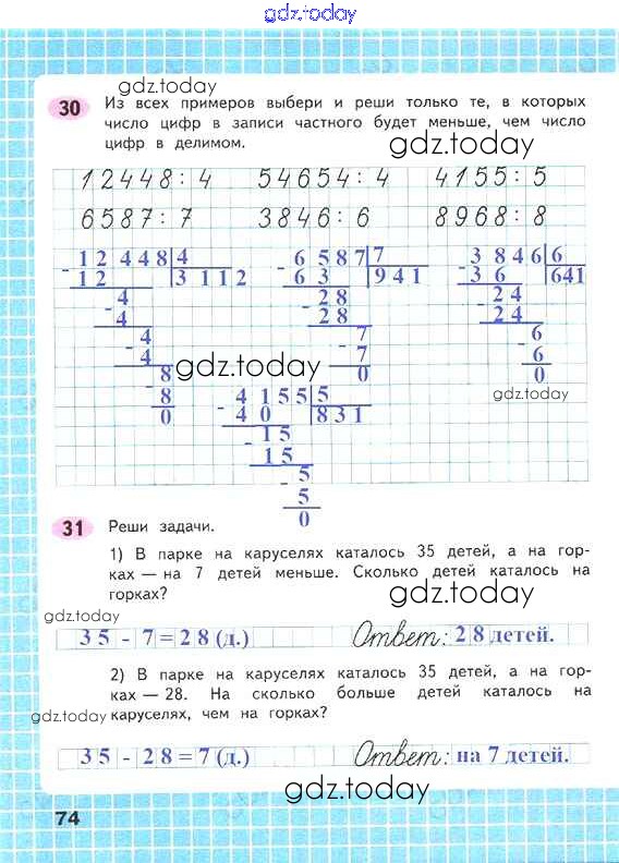 На страницах сайта gdz.today вы найдете учебный и вспомогательный материал, направленный на улучшения знаний школьной программы. ГДЗ - онлайн мир знаний Решение к части 1. Страницы 74 Рабочей тетради по Математике для 4 класса Волкова Просвещение Школа России 2016