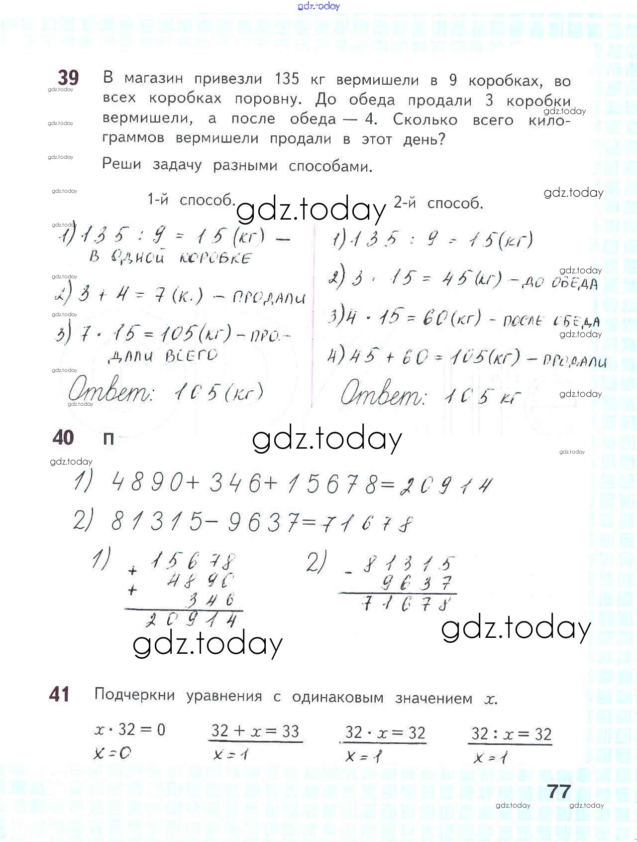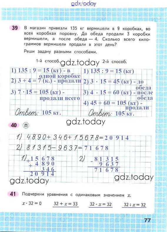 На страницах сайта gdz.today вы найдете учебный и вспомогательный материал, направленный на улучшения знаний школьной программы. ГДЗ - онлайн мир знаний Решение к части 1. Страницы 77 Рабочей тетради по Математике для 4 класса Волкова Просвещение Школа России 2016