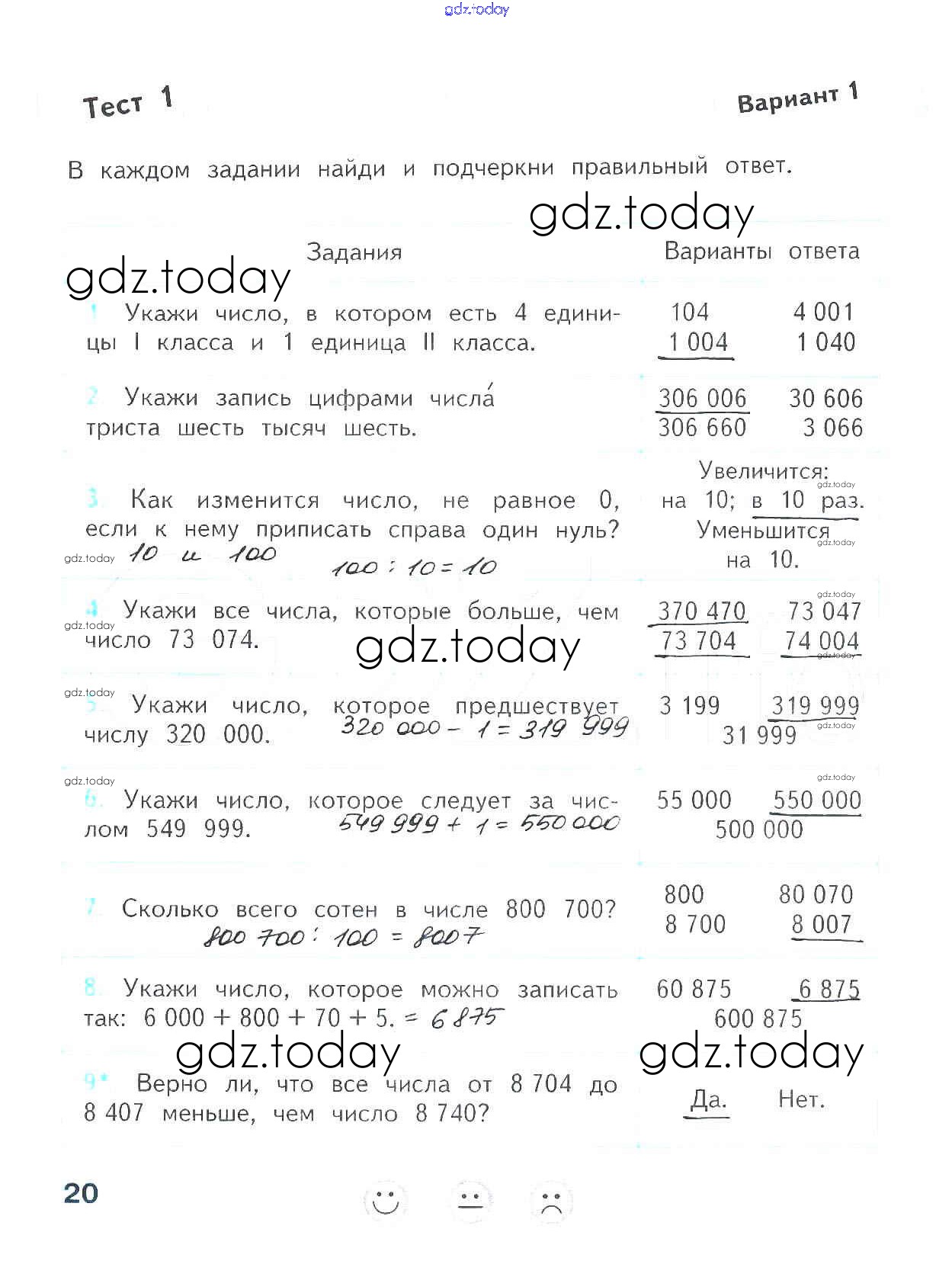 На страницах сайта gdz.today вы найдете учебный и вспомогательный материал, направленный на улучшения знаний школьной программы. ГДЗ - онлайн мир знаний Страницы (решение) 20 Проверочным работам по Математике для 4 класса Волкова Просвещение Школа России 2014