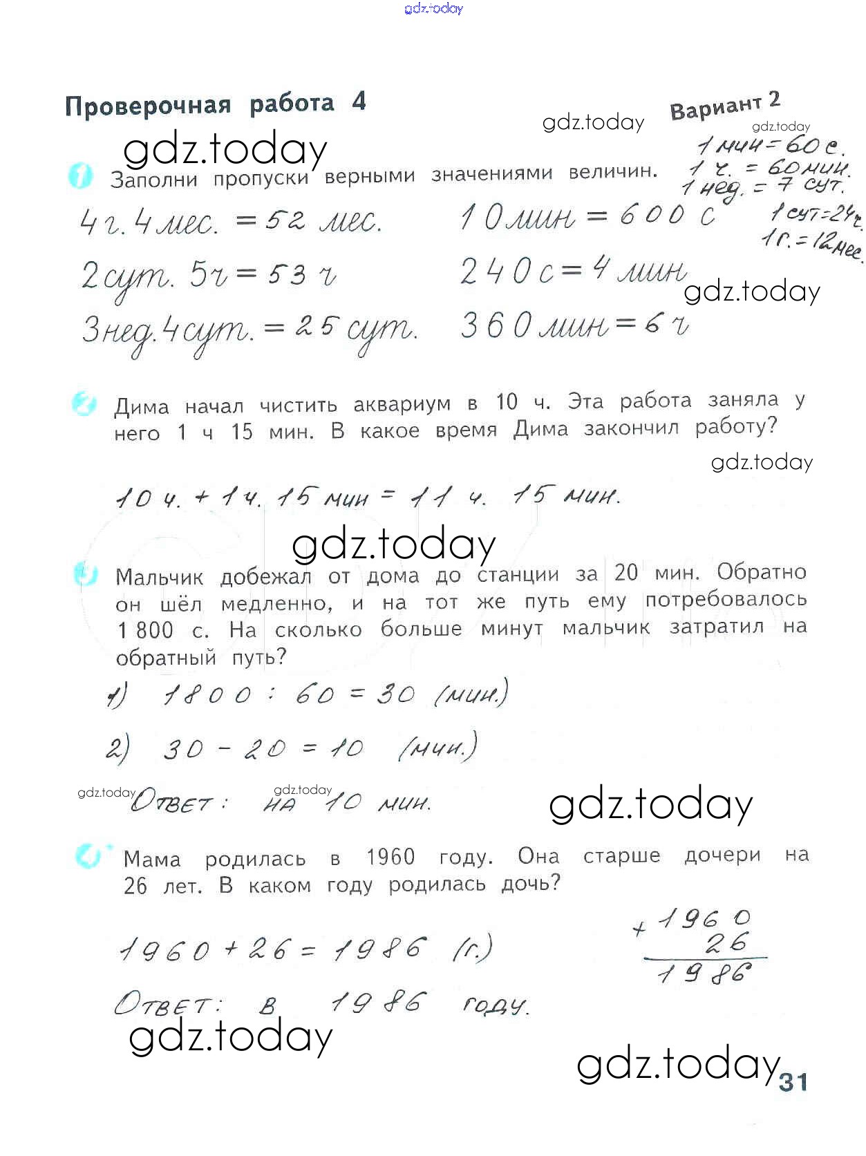 На страницах сайта gdz.today вы найдете учебный и вспомогательный материал, направленный на улучшения знаний школьной программы. ГДЗ - онлайн мир знаний Страницы (решение) 31 Проверочным работам по Математике для 4 класса Волкова Просвещение Школа России 2014