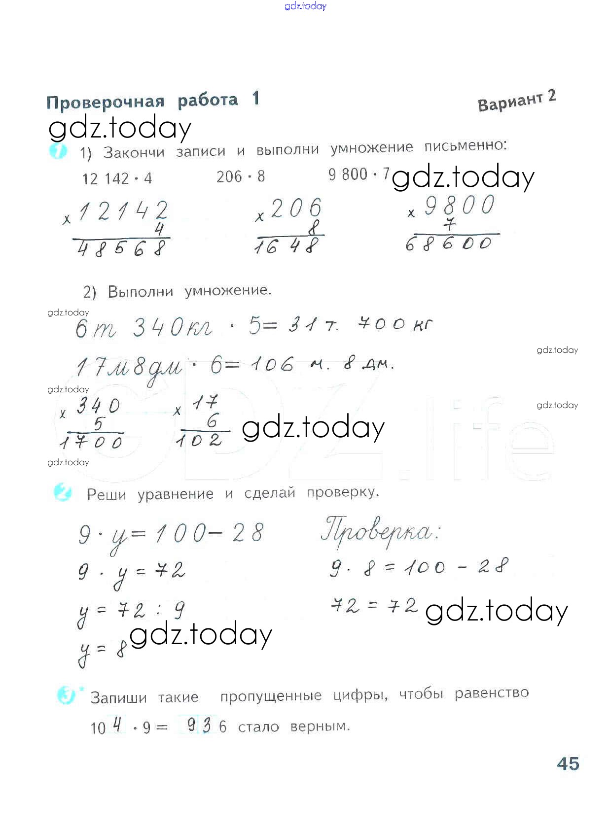 На страницах сайта gdz.today вы найдете учебный и вспомогательный материал, направленный на улучшения знаний школьной программы. ГДЗ - онлайн мир знаний Страницы (решение) 45 Проверочным работам по Математике для 4 класса Волкова Просвещение Школа России 2014
