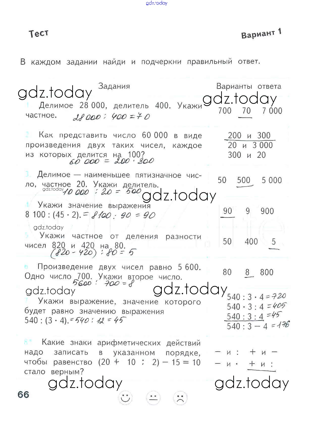 На страницах сайта gdz.today вы найдете учебный и вспомогательный материал, направленный на улучшения знаний школьной программы. ГДЗ - онлайн мир знаний Страницы (решение) 66 Проверочным работам по Математике для 4 класса Волкова Просвещение Школа России 2014