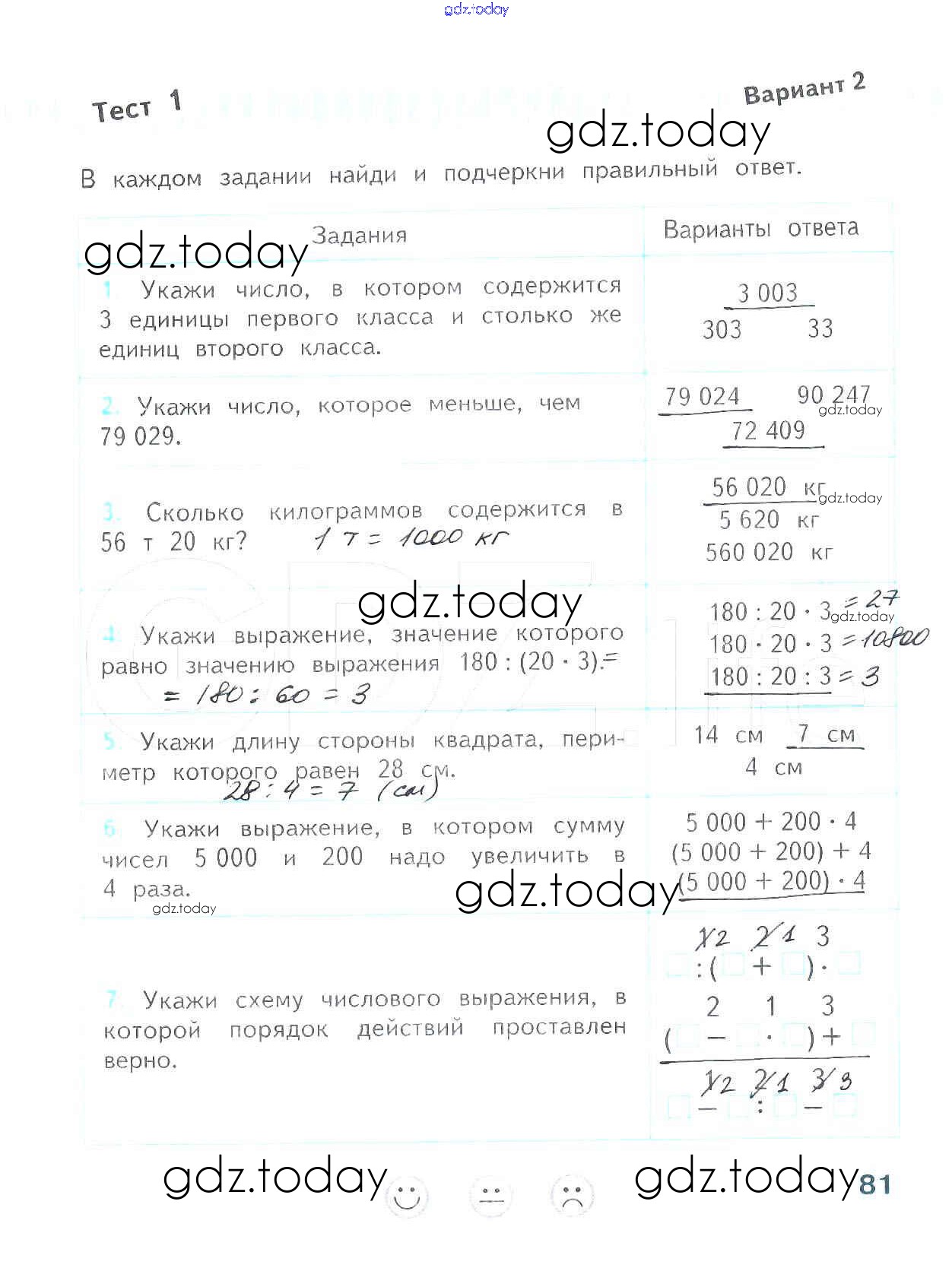 На страницах сайта gdz.today вы найдете учебный и вспомогательный материал, направленный на улучшения знаний школьной программы. ГДЗ - онлайн мир знаний Страницы (решение) 81 Проверочным работам по Математике для 4 класса Волкова Просвещение Школа России 2014