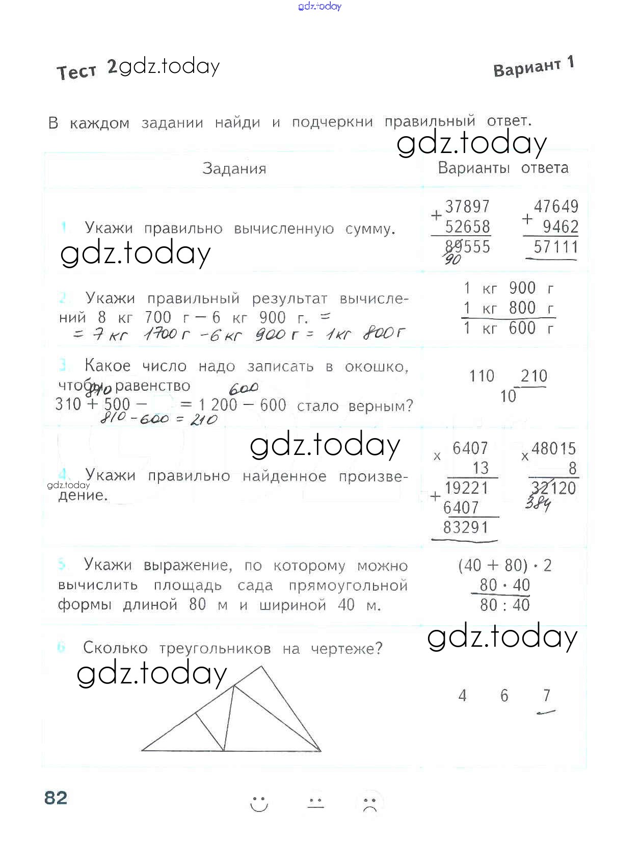 На страницах сайта gdz.today вы найдете учебный и вспомогательный материал, направленный на улучшения знаний школьной программы. ГДЗ - онлайн мир знаний Страницы (решение) 82 Проверочным работам по Математике для 4 класса Волкова Просвещение Школа России 2014