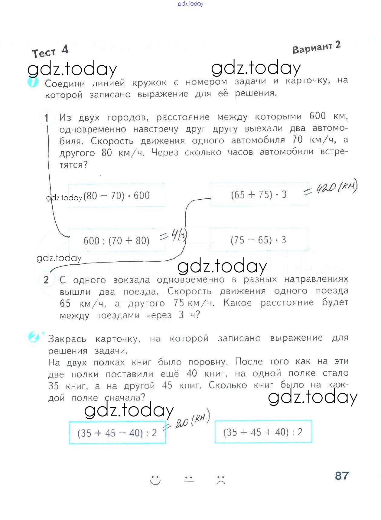 На страницах сайта gdz.today вы найдете учебный и вспомогательный материал, направленный на улучшения знаний школьной программы. ГДЗ - онлайн мир знаний Страницы (решение) 87 Проверочным работам по Математике для 4 класса Волкова Просвещение Школа России 2014