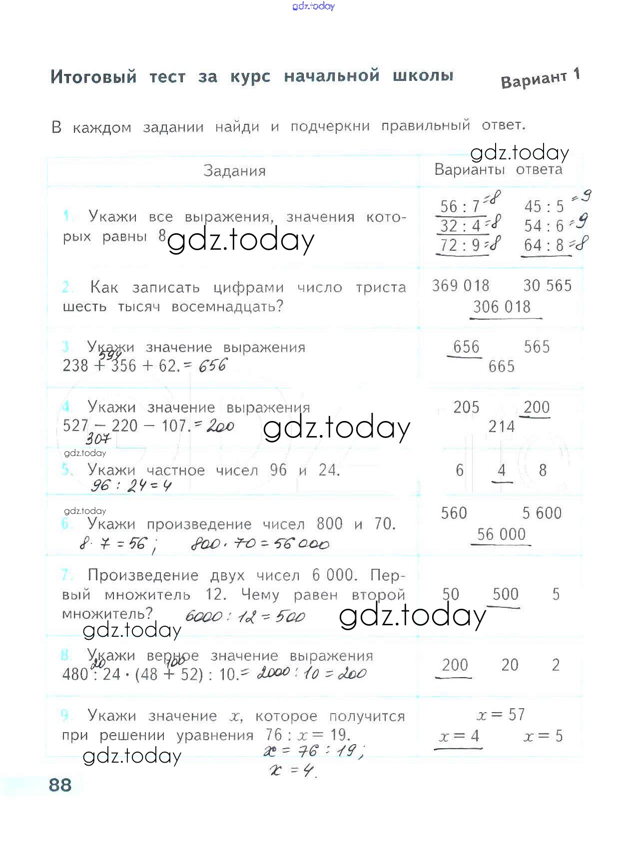 На страницах сайта gdz.today вы найдете учебный и вспомогательный материал, направленный на улучшения знаний школьной программы. ГДЗ - онлайн мир знаний Страницы (решение) 88 Проверочным работам по Математике для 4 класса Волкова Просвещение Школа России 2014