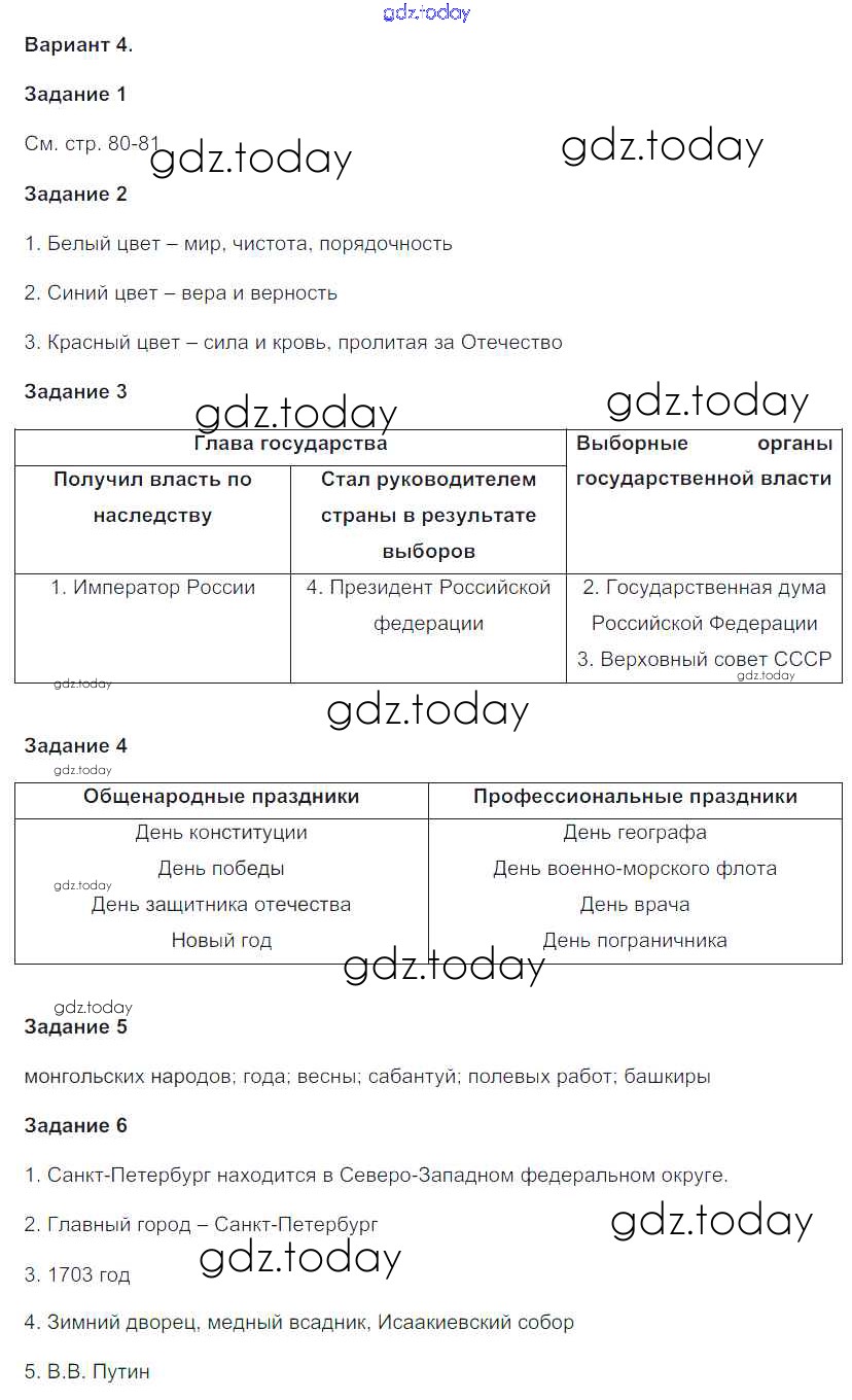 На страницах сайта gdz.today вы найдете учебный и вспомогательный материал, направленный на улучшения знаний школьной программы. ГДЗ - онлайн мир знаний Решение к проверочной работе №-6. Варианты 4 Проверочным работам по Окружающему миру для 4 класса Плешаков, Крючкова Просвещение Школа России 2018