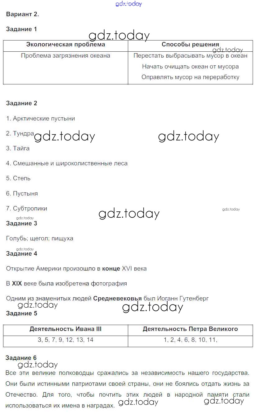 На страницах сайта gdz.today вы найдете учебный и вспомогательный материал, направленный на улучшения знаний школьной программы. ГДЗ - онлайн мир знаний Решение к итоговым проверочным работам 4 класс. Варианты 2 Проверочным работам по Окружающему миру для 4 класса Плешаков, Крючкова Просвещение Школа России 2018