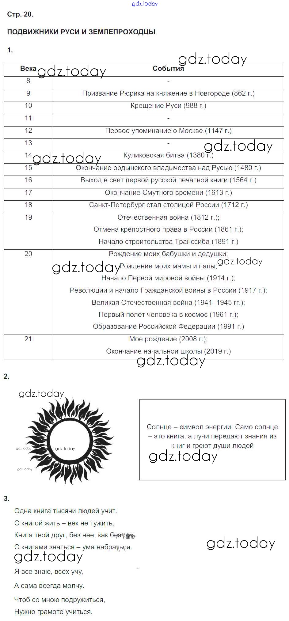 На страницах сайта gdz.today вы найдете учебный и вспомогательный материал, направленный на улучшения знаний школьной программы. ГДЗ - онлайн мир знаний Решение к части 2. Страницы 20 Рабочей тетради по Окружающему миру для 4 класса Плешаков, Новицкая Просвещение Перспектива 2015
